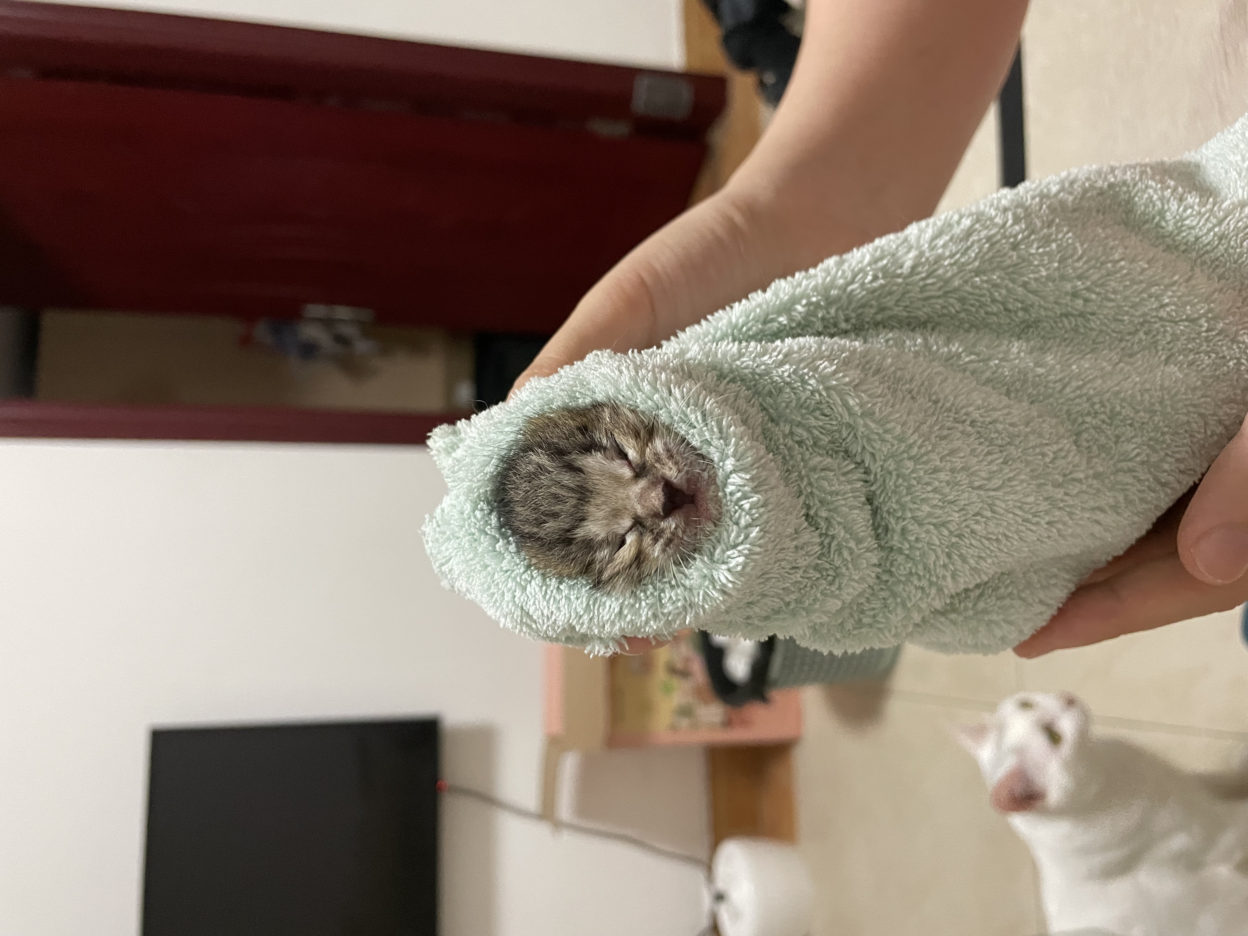 After hesitating, we decided to bring this kitten back to Guangzhou at first. This is my first time to adopt this kind of newborn cat. I asked many friends and vet hospitals for suggestions on how to feed it. Parenting a newborn kitten is a pain in the ass, for the first few days it needs to be fed every few hours and helped to defecate by hand.
