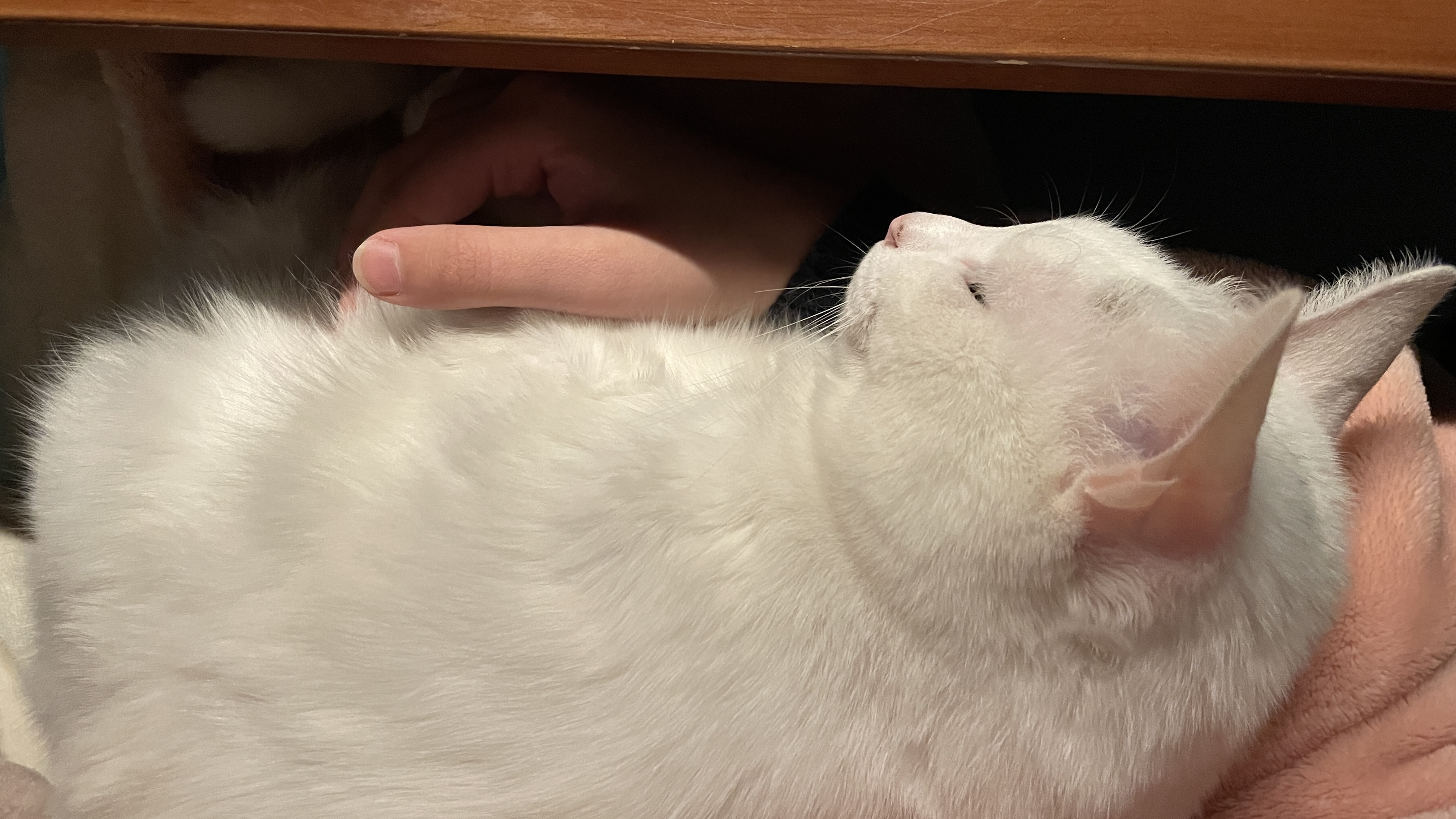 (About my first cat) In the second half of 2020, I used to feed stray cats in the neighborhood. I found a white kitten about 3 months old. It is said that the white cat is timid, and it is true. At first it was very afraid of people and ran away as soon as it saw people approaching. But the good thing was that the orange cats in the neighborhood were very close to humans, and it learned a lot from following them and it gradually became much more human-friendly.