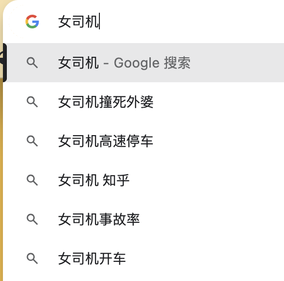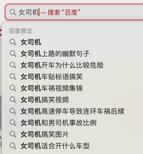在这两个搜索引擎里搜索“女司机”这个关键词,会得到以下这些搜索关联词。