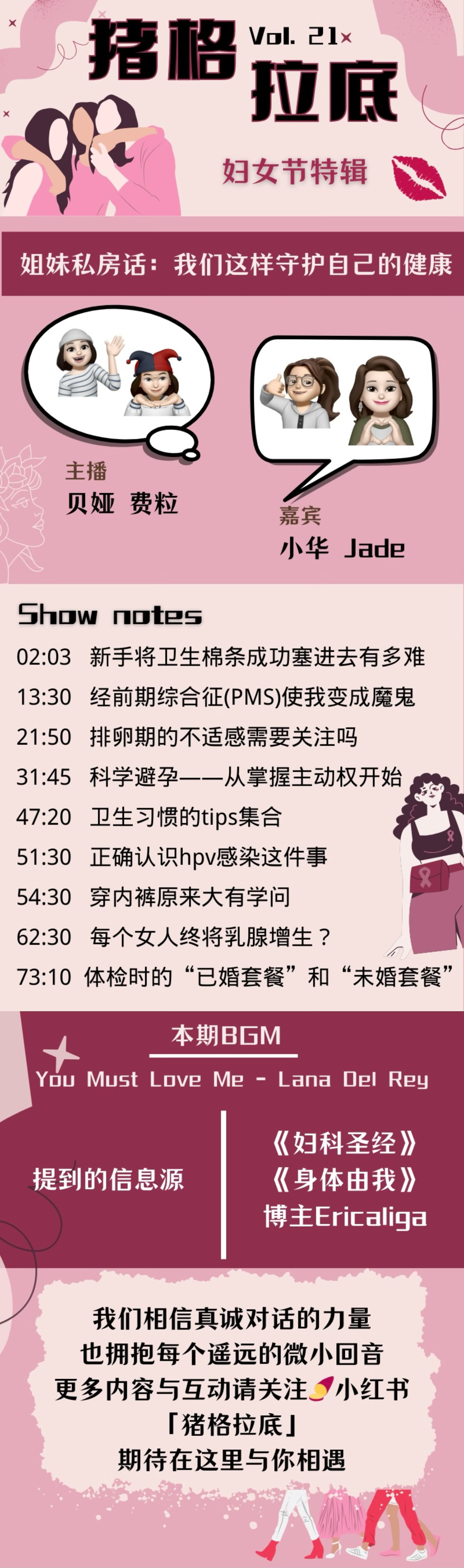 02:03 新手将卫生棉条成功塞进去有多难13:30 经前期综合征(PMS)使我变成魔鬼21:50 排卵期的不适感需要关注吗 31:45 科学避孕——从掌握主动权开始47:20 卫生习惯的tips集合51:30 正确认识hpv感染这件事54:30 穿内裤原来大有学问62:30 每个女人终将乳腺增生?73:10 体检时的“已婚套餐”和“未婚套餐”