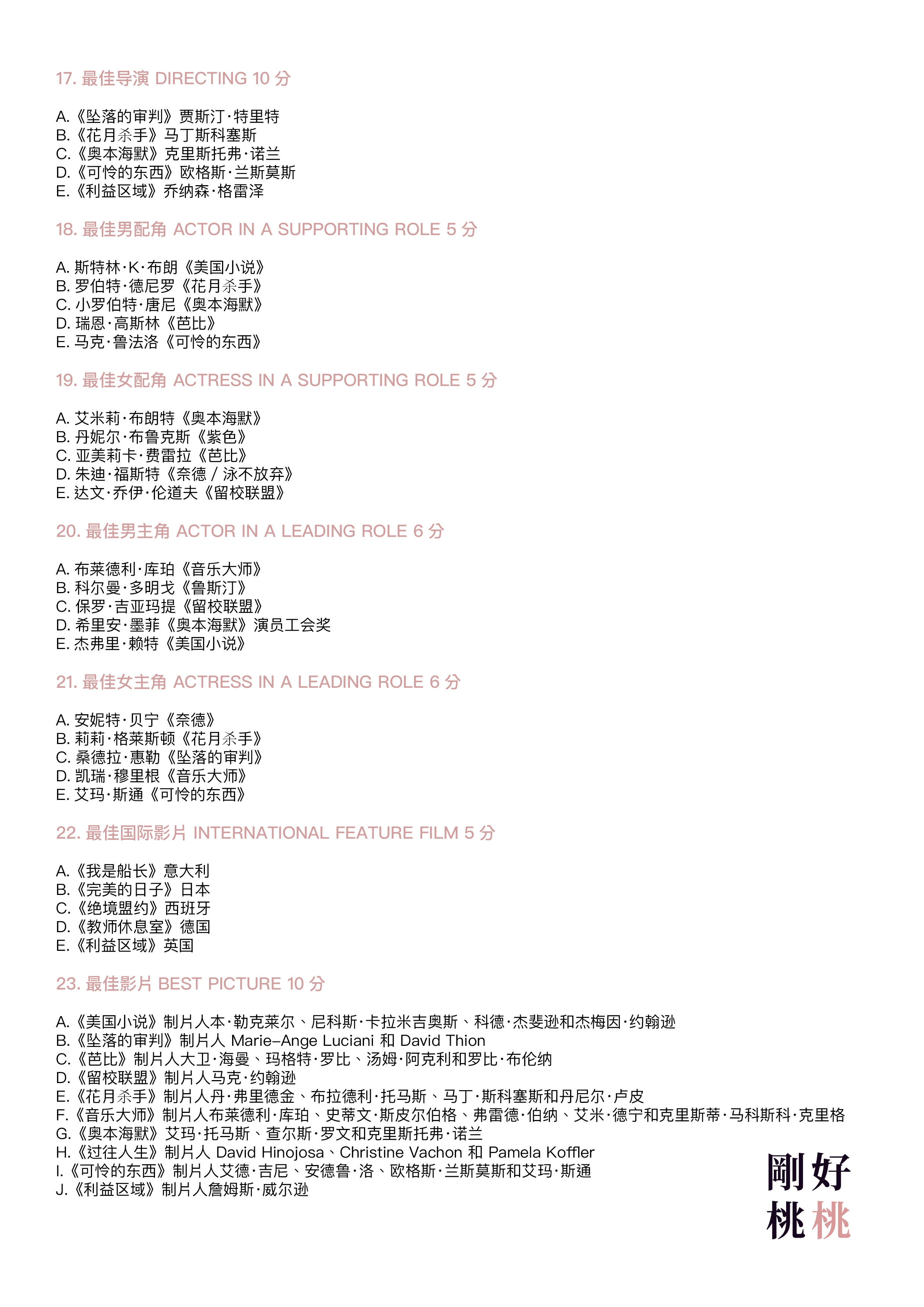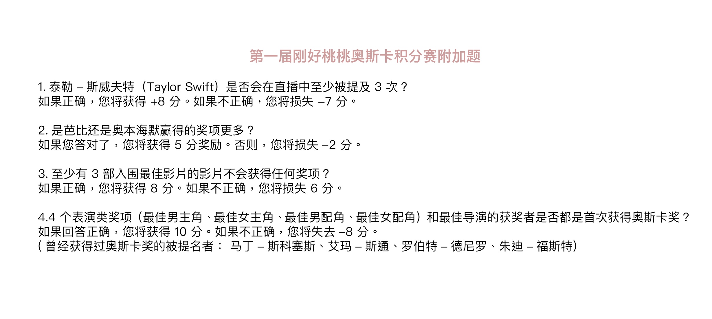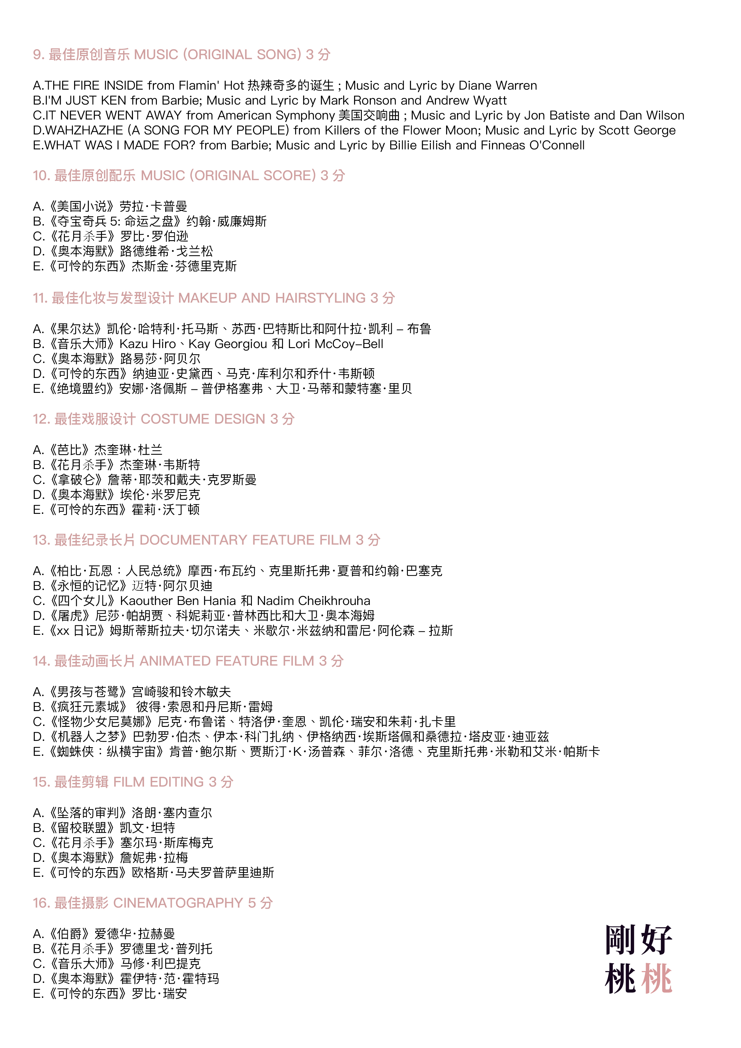 感谢理解我们制定了这么复杂的规则还答题的每个听众朋友哈哈哈,分数多少无所谓,只是一次参与的纪念。每个参加的听友都将获得我们送出的96届奥斯卡最佳影片《奥本海默》的正版中文原著一本!新的一年我们继续看电影,谈电影,有空就来听听刚好桃桃吧🥂😉