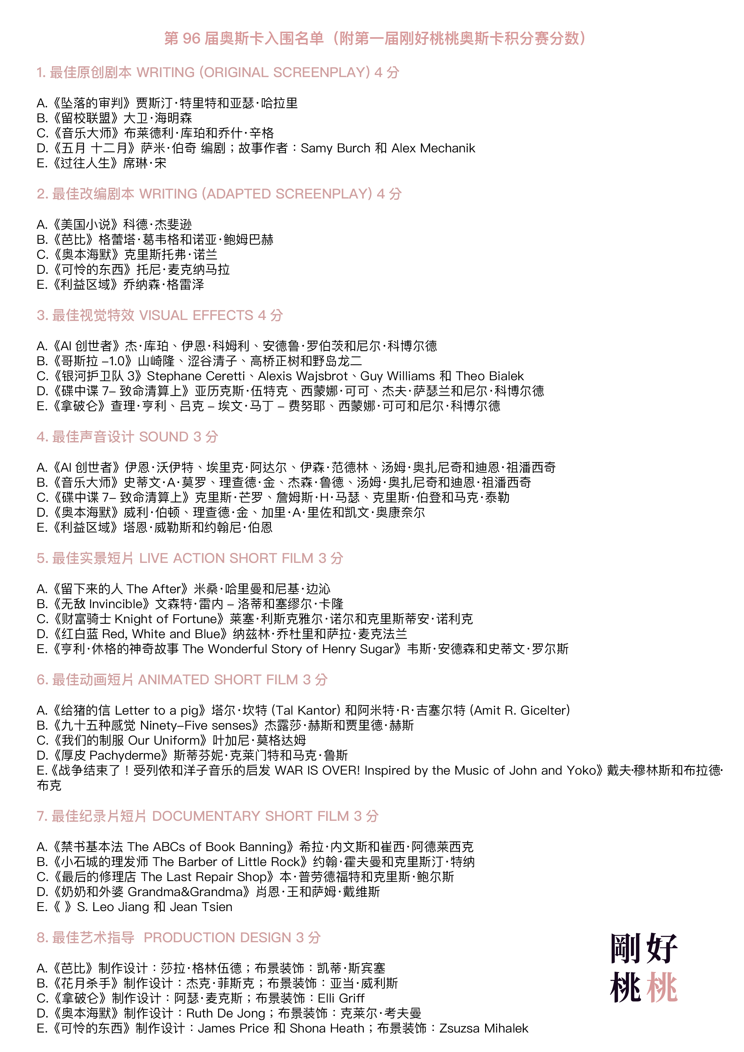 第一届刚好桃桃积分赛参与规则:收听我们本期节目,在评论区留下你的预测!最好是根据我们的节目顺序来答题喔,在奥斯卡颁奖第一时间公布后我将回复大家的分数,参与即有机会获得我和刚爸精心准备的电影周边礼物一份🎁 Stay tuned!