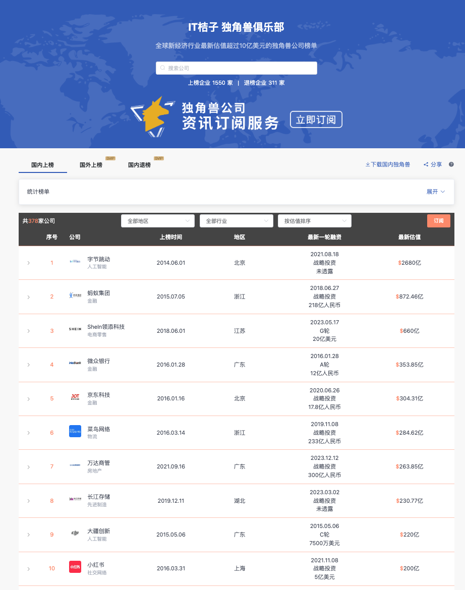 IT桔子作为一家第三方创投数据平台,实时的在记录中国独角兽公司的新生与退出,我们的“独角兽俱乐部”也是经久不衰的热门产品页面了。