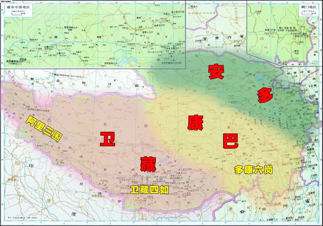对整个藏族分布地区有多钟地理划分法,古时曾划分为卫藏四翼(有的版本作卫藏四茹)、阿里三围、多康六岗(其中,多为安多、康为康巴)等地区,现在用得比较多的划分方法是将藏区划分为“卫、康、多”三个地区,并将这三个地区的特征概括为“卫藏法区、康巴人区、安多马区”,其义为卫藏是佛法兴盛之地,康区的人美貌英俊,而安多是产宝马的地方。