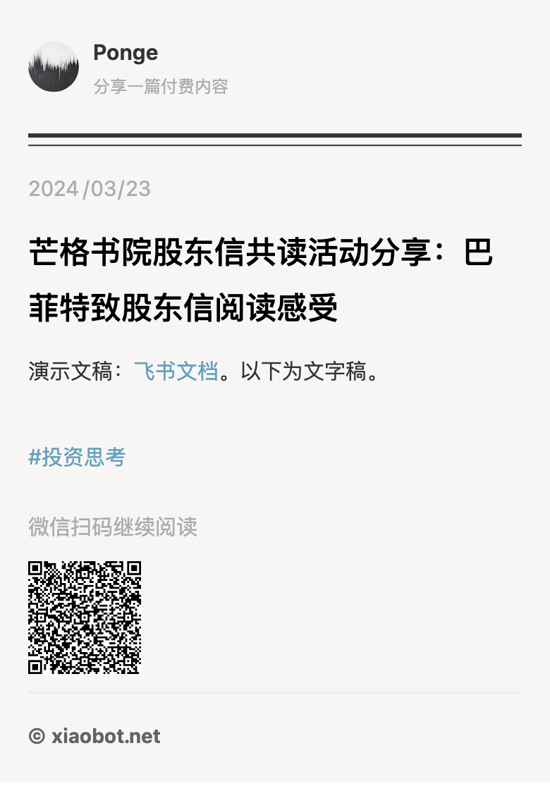 本期内容是 2024 年 3 月 23 日晚,在芒格书院巴芒共读会上分享的题为《巴菲特股东信阅读感受》的主要内容。仅收录了我个人分享的部分,后面互动的环节考虑到可能需要征求其他人的同意,就没有放出来了。