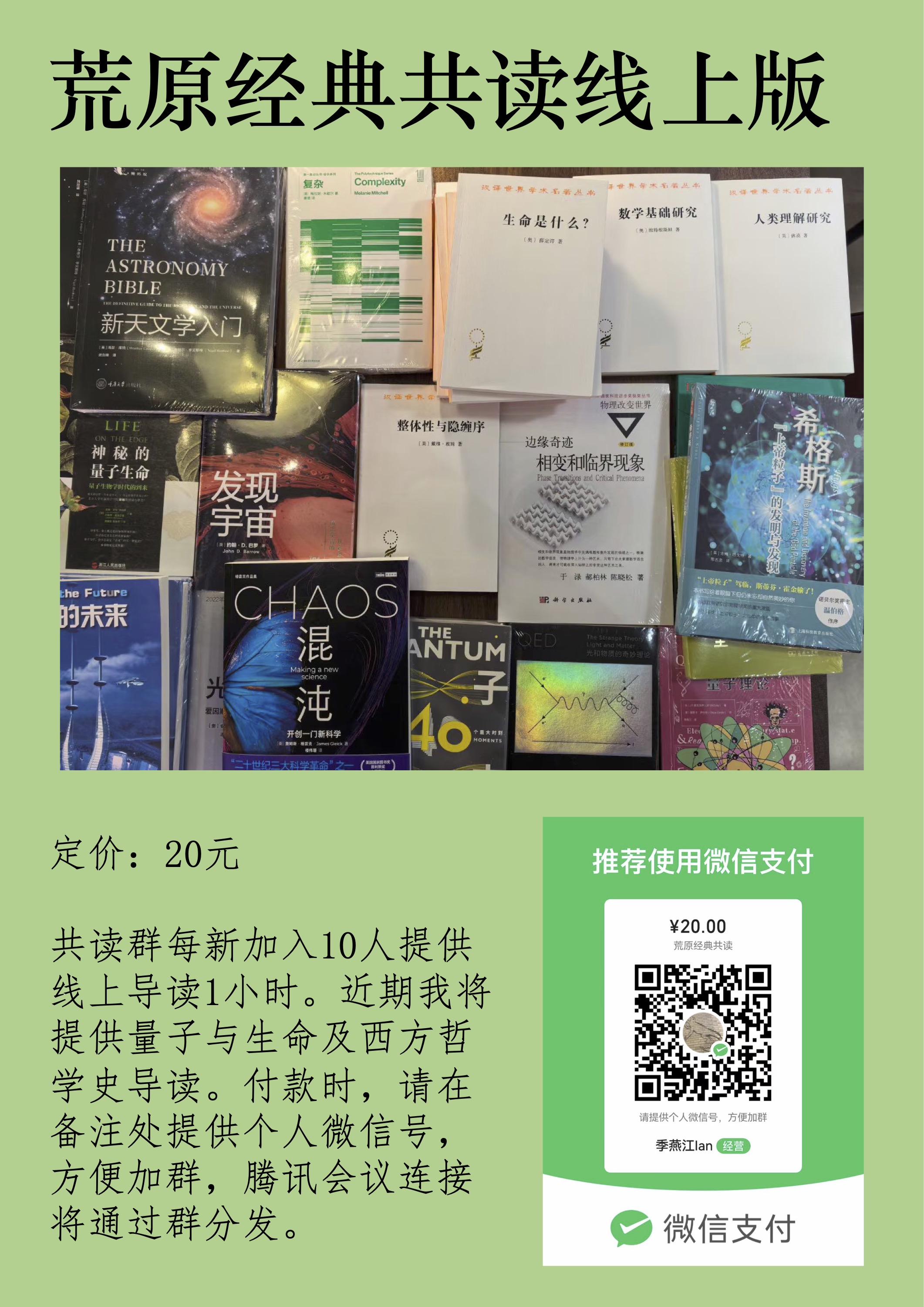 正在推动一个线上读书会项目,逻辑是每增加10名共读成员(收费20RMB),我们将组织一次1小时的导读活动。形式有可能是我一个人单口,也可能采取这次几人漫谈的形式,欢迎加入,并记得提供正确的微信ID以方便联络。