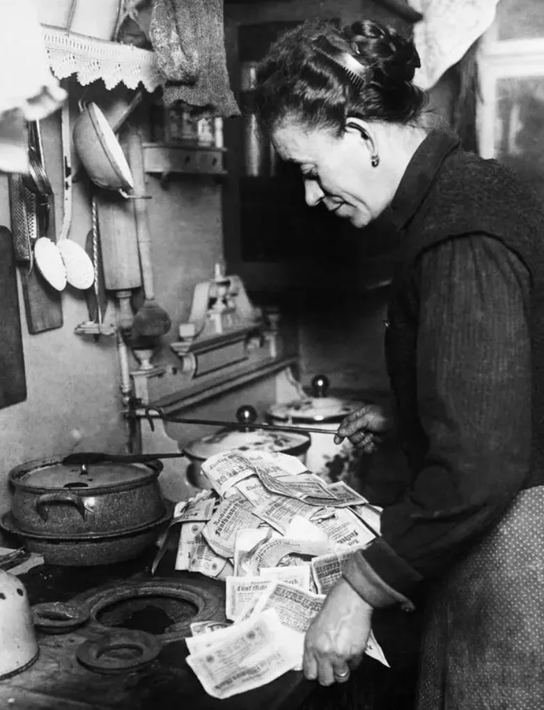 1922年德国货币贬值,家庭主妇烧钱点燃炉子