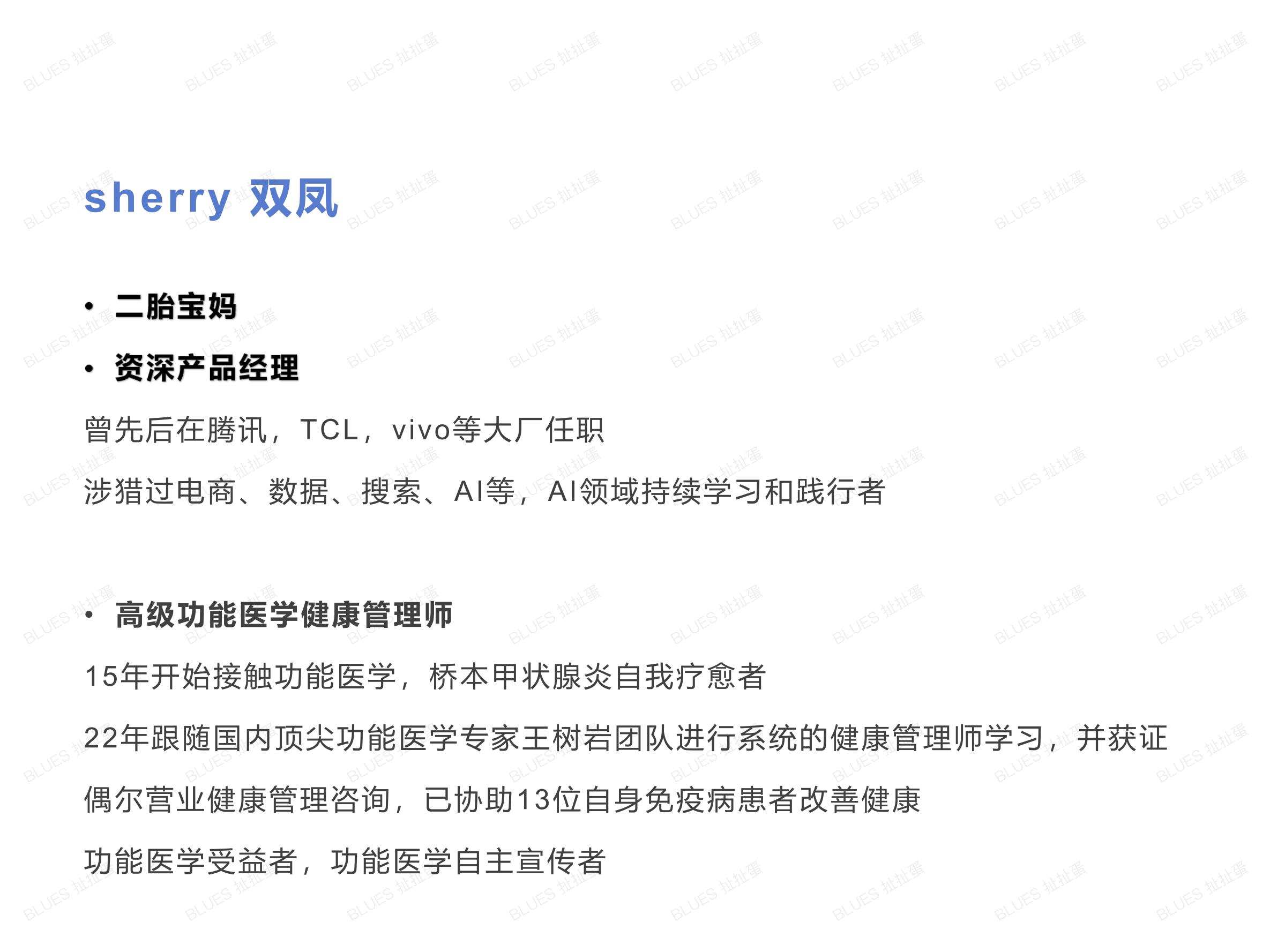 三个标签介绍一下自己。1. 二胎宝妈一枚,晚上娃陪睡女仆一枚。2. 资深产品经理,前后在腾讯、vivo等大厂呆过,涉及过电商、搜索、AI、手机等,现在主要专注于AI应用。3. 高级功能医学健康管理师。15年开始接触功能医学,桥本甲状腺炎自我疗愈者;2022年跟随国内顶尖功能医学专家王树岩团队进行系统的健康管理师学习,并获证;偶尔营业健康管理咨询,已协助13位自身免疫病患者改善健康;功能医学受益者,功能医学自主宣传者。