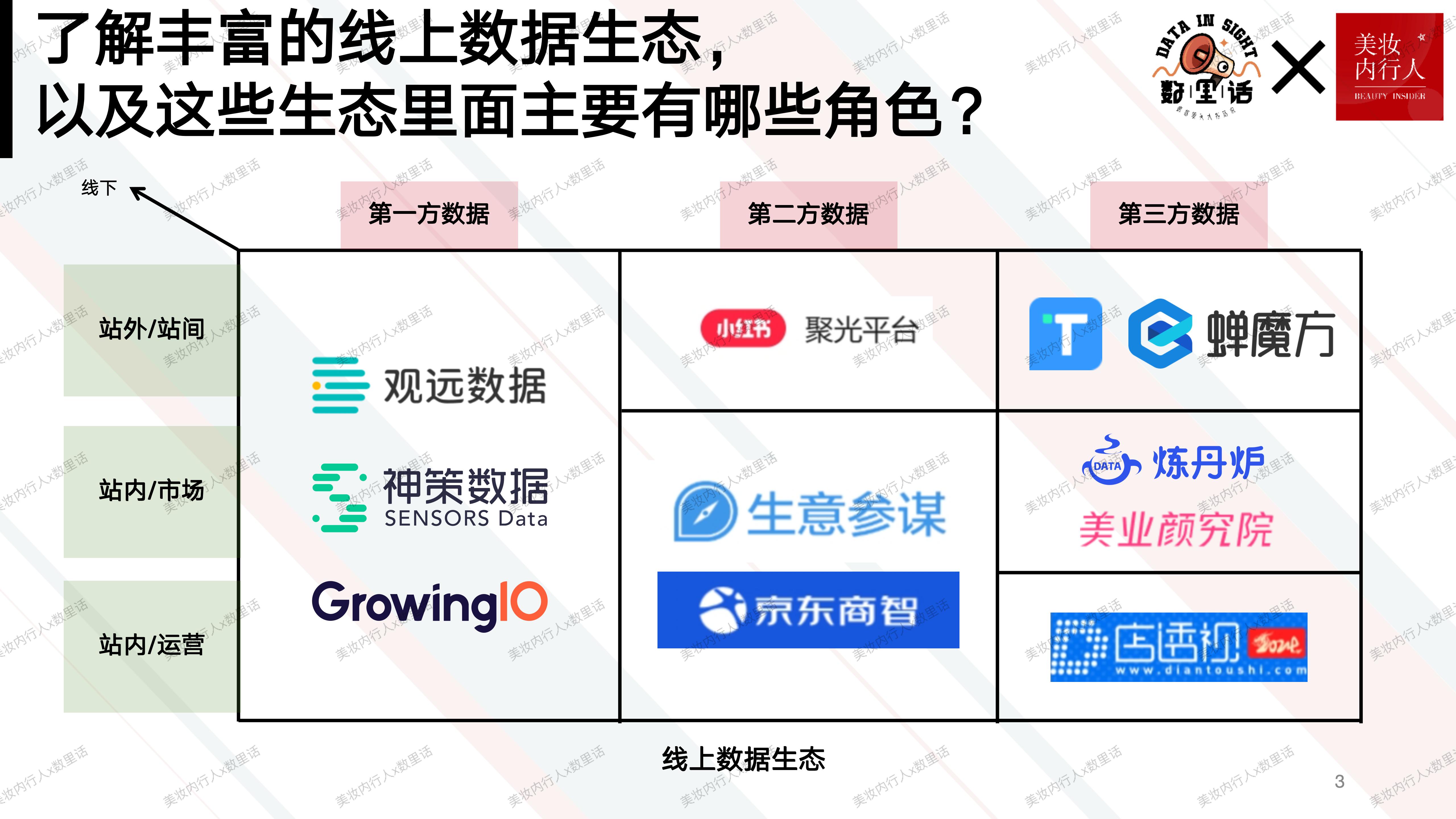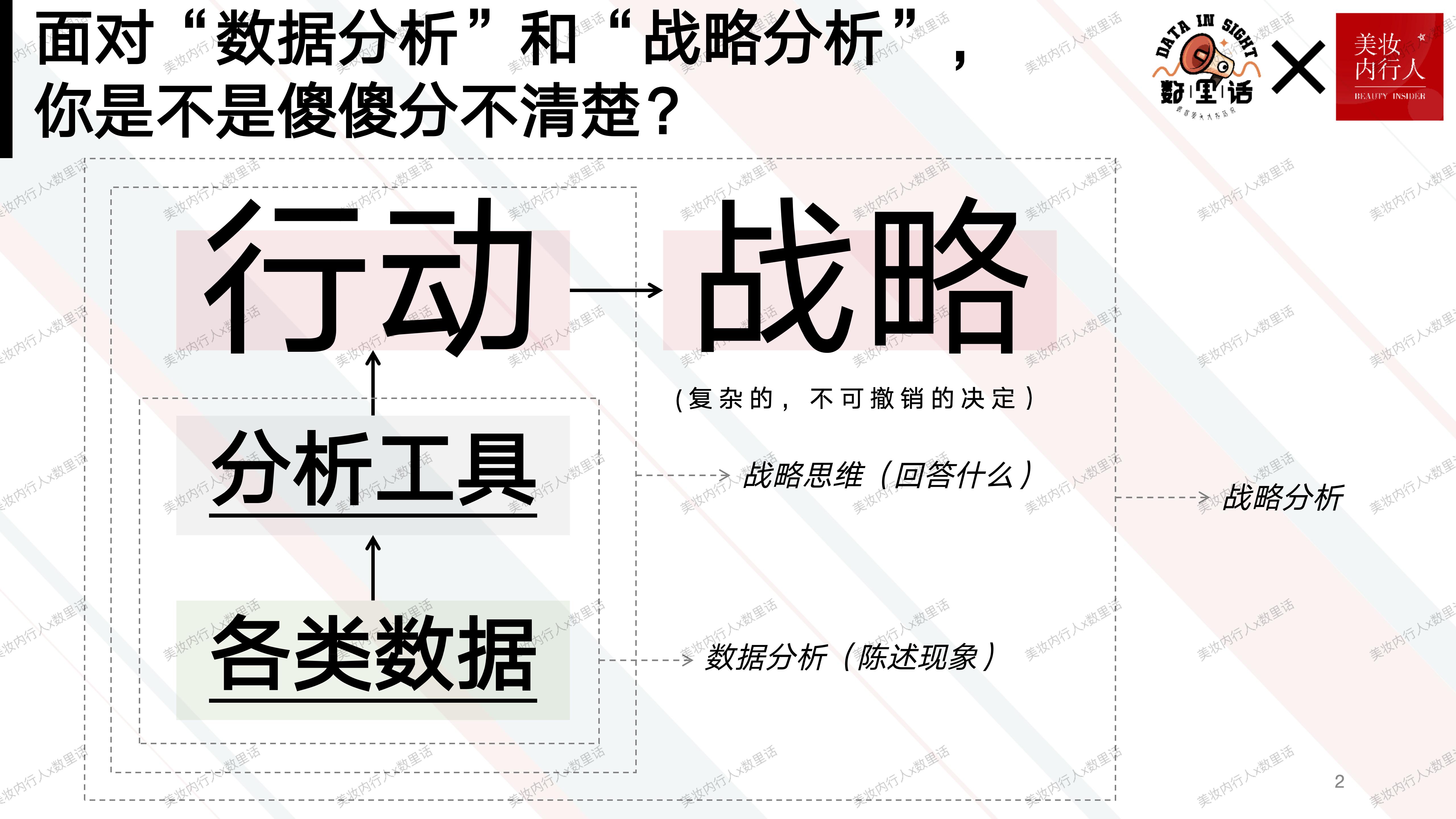 首先,数据在战略分析中扮演着关键角色,它帮助团队达成共识,提供确凿的证据支持决策。然而,数据并非战略分析的唯一解法。市场上数据种类繁多,服务公司众多,但没有任何数据工具是万能的。数据可分为三类:第一方数据,源自品牌自身;第二方数据,平台共享数据;第三方数据,由服务公司采集。