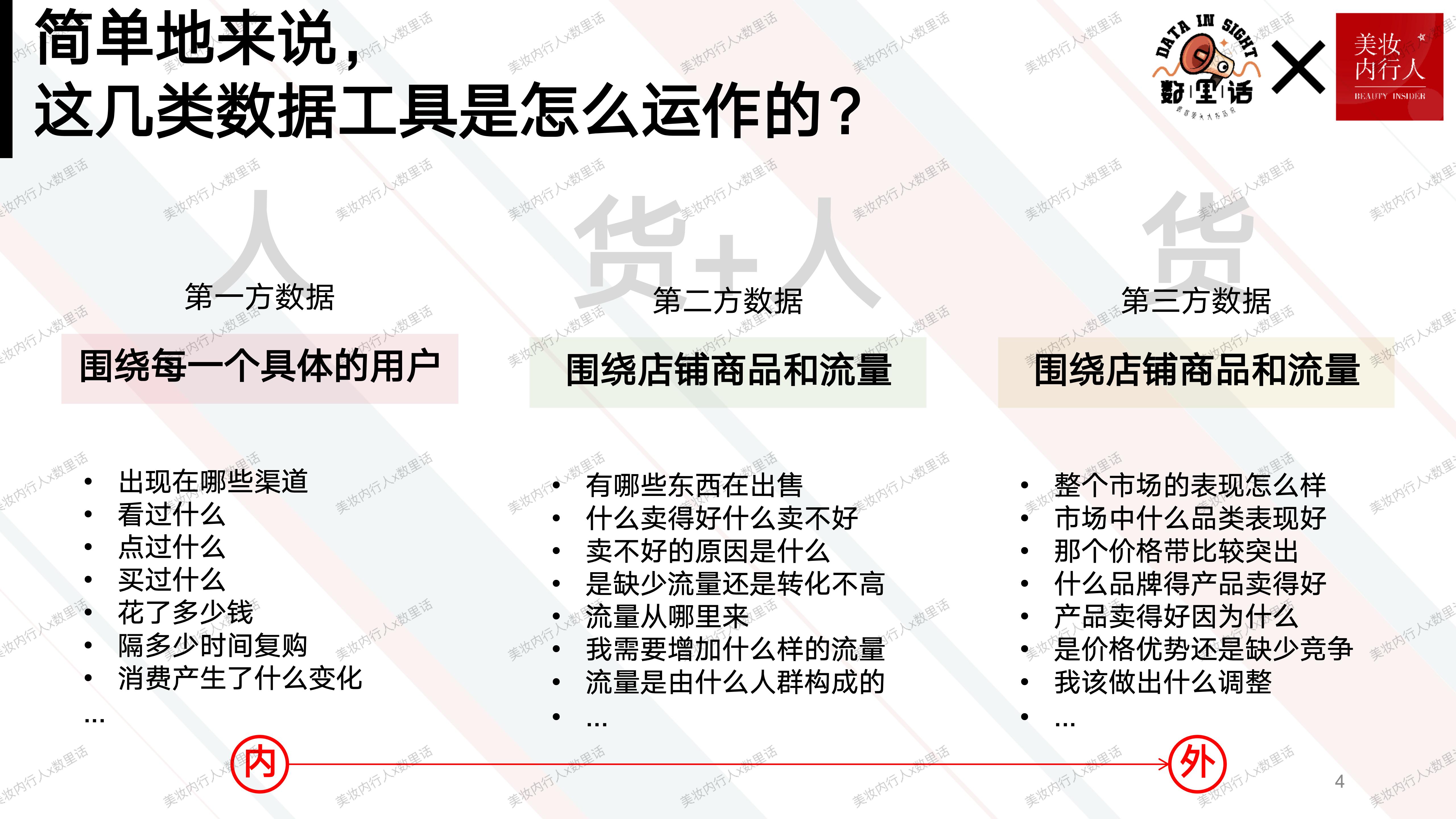 第一方数据提供了最具体的用户画像,适用于精准优化。第二方数据,如生意参谋,提供了市场数据,帮助品牌了解外部情况。第三方数据则提供了深入的市场和竞争信息,类似于品牌的私人卫星,全面审视竞争环境。