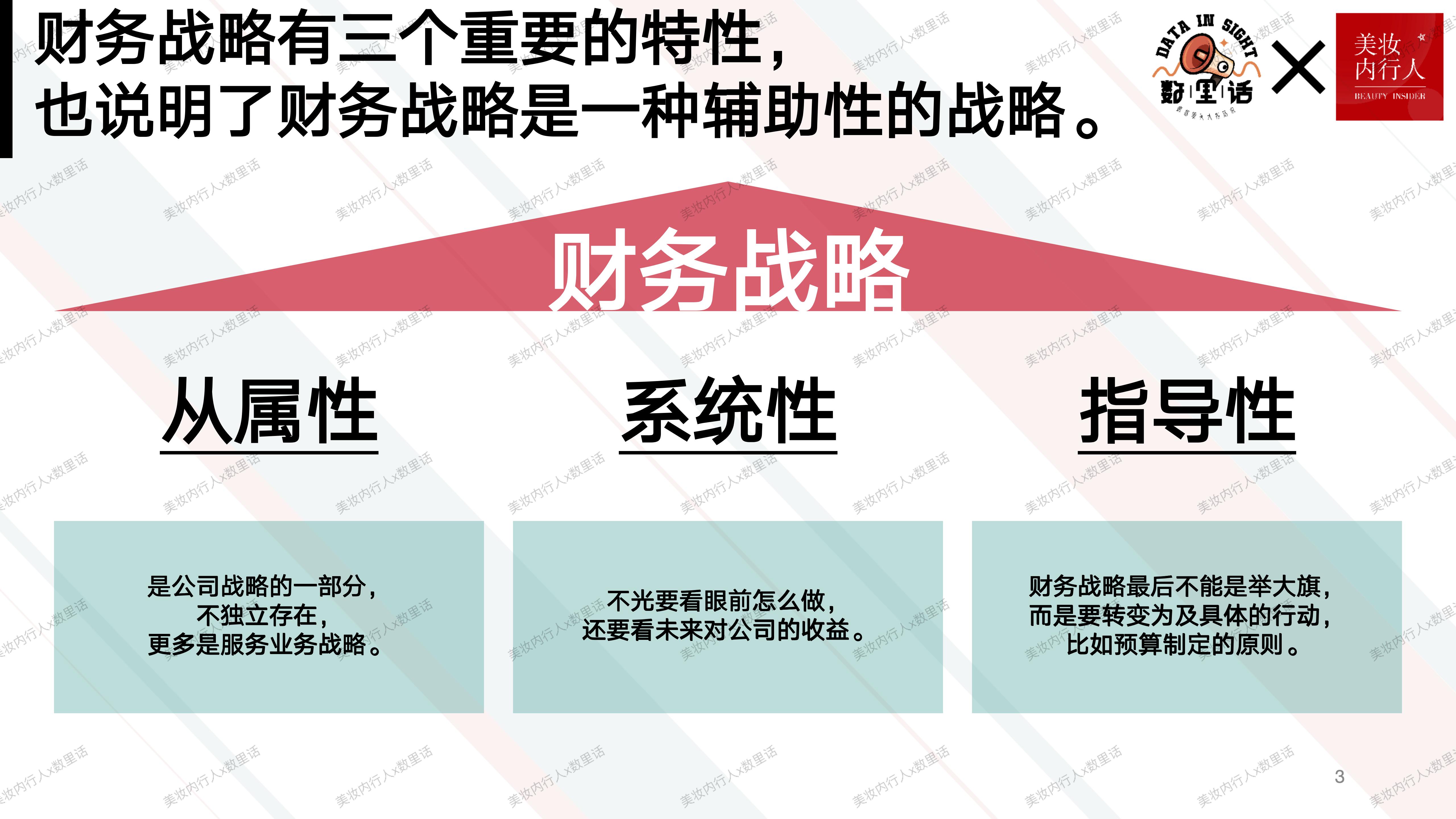 我们介绍了财务战略的三个特点:“从属性”、“系统性”和“指导性”。这意味着财务战略应服务于公司的整体战略目标,需要全面考虑企业的财务需求和挑战,并作为企业日常运营和决策的行动指南。