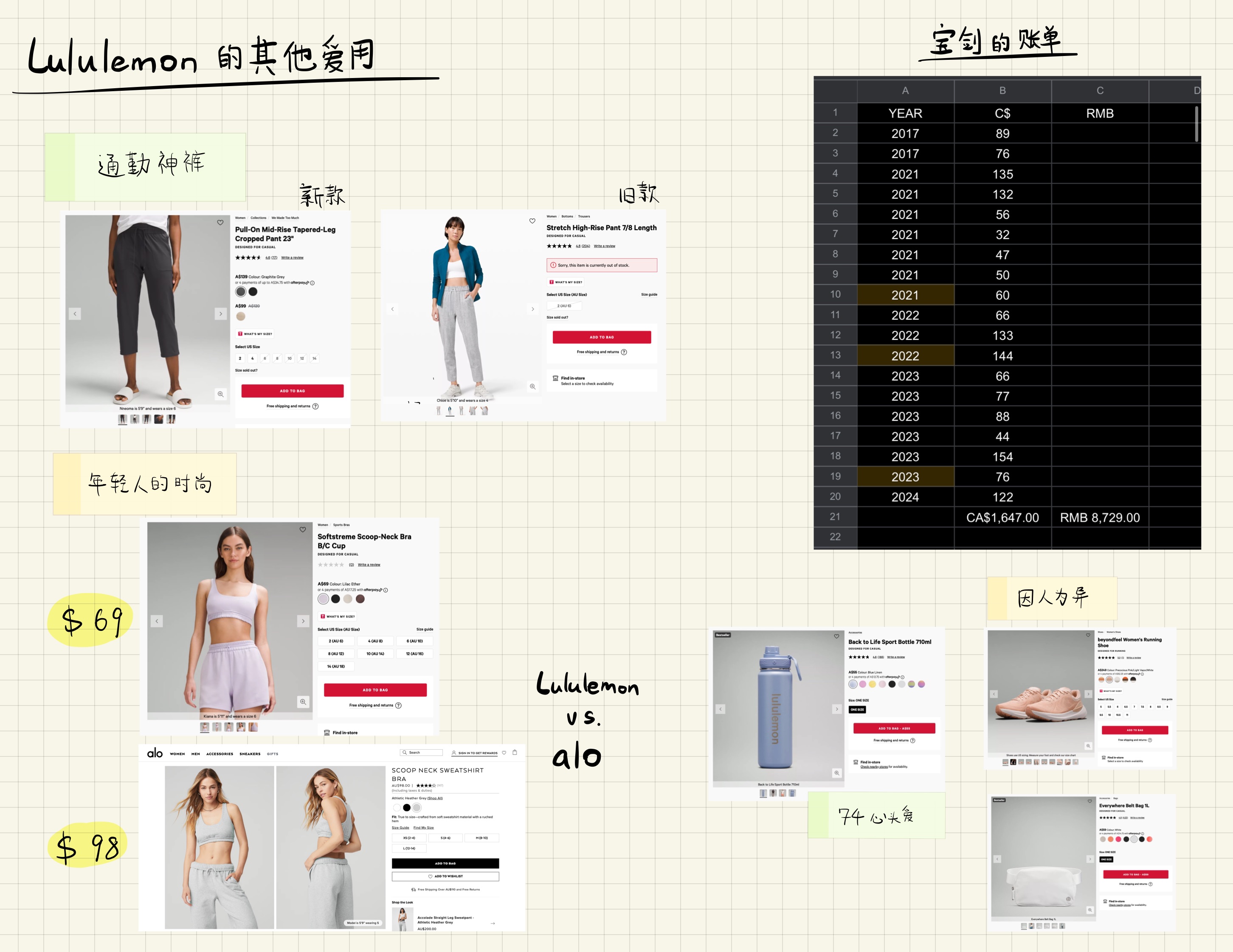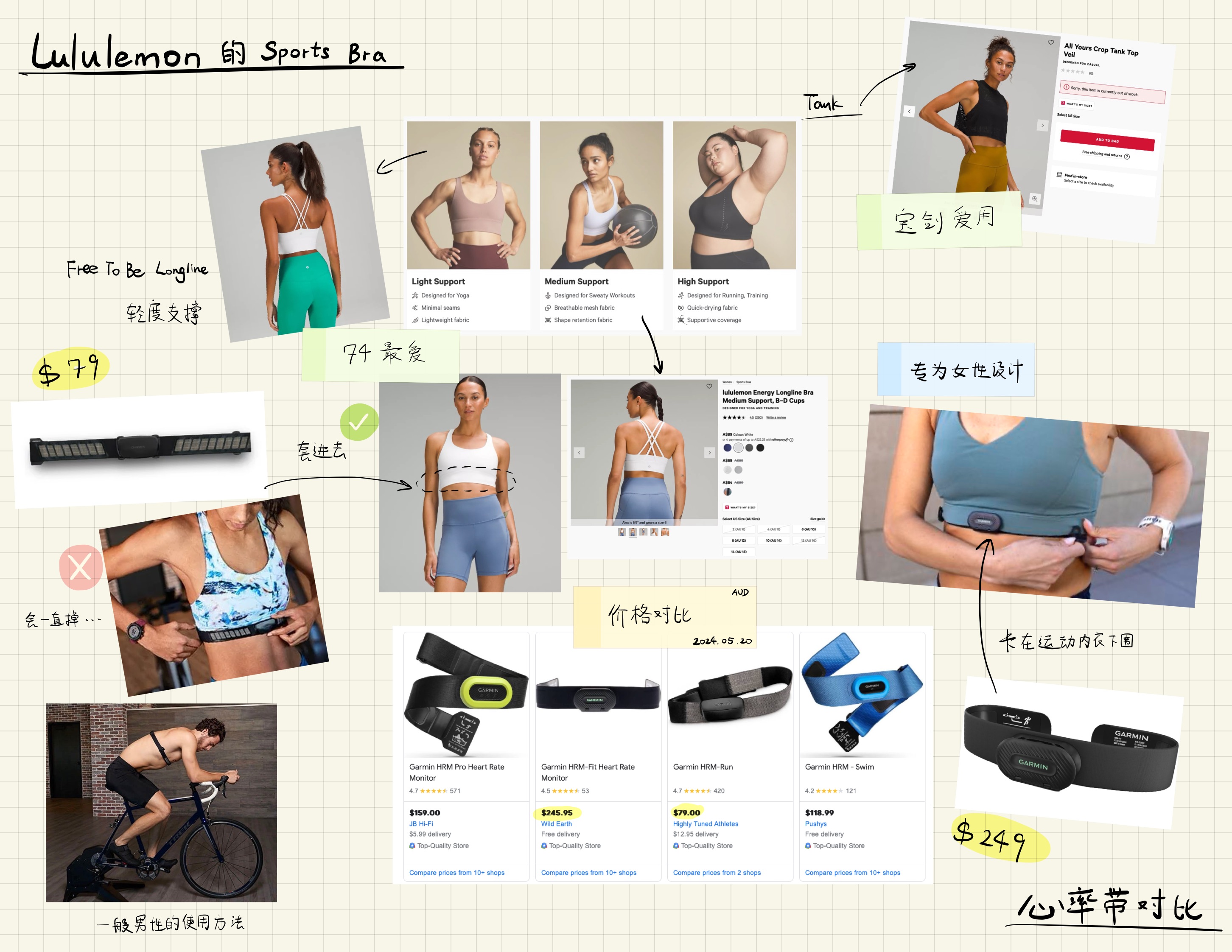 这期宝剑和74准备一起来盘盘这些年买过的Lululemon的运动装备,看看自己到底花了多少钱。我们最爱用的Lululemon leggings和运动内衣是哪款?另外聊聊女生根本戴不住、老往下掉的运动心率带,和拯救74骑车一直疼的女性专用车座到底长什么样。(精彩配图在最下面)