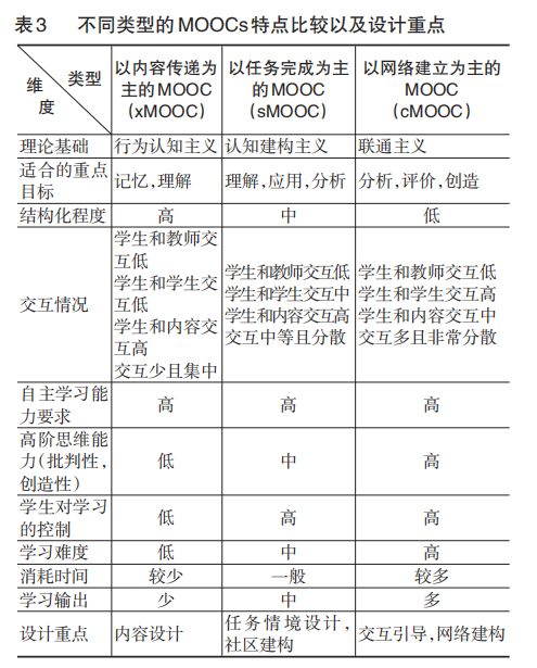 【摘 要】MOOCs的发展经历了从2012年的狂热支持, 到2013年的反对声日益高涨的急速转变之后, 如何有效设计高质量的MOOCs成为研究者和实践者日益关注的重要问题。教学目标与教学交互是网络课程设计的两大关键。基于布鲁姆认知目标分类以及穆尔的教学交互分析框架对现有三种MOOCs实践形式进行分析发现:以内容传递为主的MOOCs (xMOOCs) 把认知行为主义作为理论基础, 强调知识的传递, 注重学生与内容的交互, 处于认知目标分类底层;以任务完成为主的MOOCs (sMOOCs) 混合了认知主义和建构主义学习理论, 强调做中学, 重视学生之间以及师生之间的交互, 处于认知目标分类的中间层;以网络建立为主的MOOCs (cMOOCs) 基于联通主义学习理论, 强调学生和内容的交互是学习发生的基础, 学生和学生的交互是学习发生的关键, 学生与教师的交互是学习发生的保障, 处于认知目标分类的最上层。三类MOOCs各有其优势和不足, 在MOOCs设计和开发的过程中需要打破这些MOOCs分类之间的界限, 根据教学目标, 选择最佳的教学内容、教学方法, 保持目标、内容、方法的一致和最佳匹配。我国在设计和开发MOOCs的过程中, 还需要思考如何利用精品课程建设的已有成果, 如何开放学习过程, 并且在此过程中形成自身特色, 吸引学习者的可持续、大规模参与。