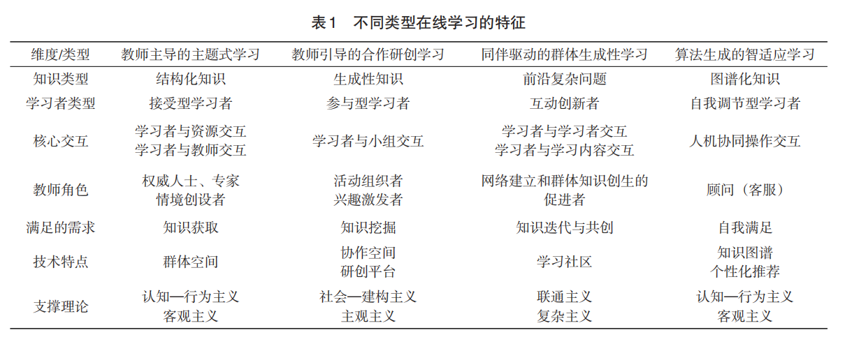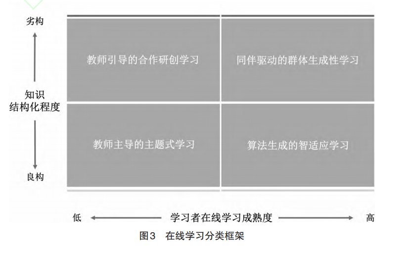 【摘 要】随着教育数字化的加速推进,在线学习已成为当前和未来教育的重要组成部分,多种实践样态正在快速发展。作为一个专业化实践领域,在线学习由哪些基本类型构成?对这一问题的研究是帮助教师根据不同情境选择合适的在线学习模式,从而有效设计在线学习、保障高质量学习发生的关键。本研究在分析在线学习实践发展趋势、分类研究的基础之上,基于交互距离理论,从知识结构化程度和学习者在线学习成熟度两个维度构建在线学习分类框架,将在线学习分为教师主导的主题式学习、教师引导的合作研创学习、同伴驱动的群体生成性学习、算法生成的智适应学习四类。同时,结合相关理论和典型实践案例,从知识类型、学习者类型、核心交互、教师角色、满足的需求、技术特点、支撑理论七个维度对四类在线学习的特征进行了总结。最后,本研究对新冠疫情期间的在线教学进行了反思,并展望了未来在线学习的发展。希望本研究能够深化实践者对在线学习的认识,帮助设计者根据知识的结构化程度和学习者在线学习成熟度综合考虑、选择并设计合适的在线学习。