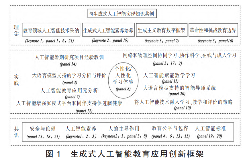 【摘 要】生成式人工智能作为一项类似于“电力”的通用技术,正在全球范围内引发智能化变革浪潮。教育领域如何面向生成式人工智能开展教育教学创新是时代赋予教育研究者和实践者的挑战。研究基于全球人工智能学习和教育研究联盟召开的人工智能赋能学习者会议的核心内容,构建了生成式人工智能教育应用创新框架,从理念、实践和共识三个层面系统展现国际生成式人工智能创新体系结构。理念层拥抱生成式人工智能创新文化,实现从制度、育人理念到教与学方式等多个层面的理论创新与认知迭代。教育领域人工智能技术采纳模型、生成式人工智能素养模型和生成主义数字教育框架分别为生成式人工智能教育应用提供了组织保障、素养培养和实践指南方面的理论支持。实践层各类实践创新要坚持以个性化/人性化学习体验为核心,围绕教育场景中的实践问题,开展创新实践和应用推广。当前国际上六类典型实践案例,分别为:(1)生成式人工智能支持网络和物理空间协同学习;(2)大语言模型推动智能导师系统应用推广;(3)生成式人工智能增强沉浸式平台和同伴支持促进脑健康;(4)大语言模型支持自动试题、干扰项和反馈生成;(5)智能学习路径规划和个性化学习支持提供;(6)亲和力小组实践推进高校生成式人工智能应用。同时,会议还形成了六大共识:(1)认识生成式人工智能教育应用创新的特殊性;(2)信任是从消极拒绝走向积极应用的前提;(3)发挥人的主导作用应对认知停滞与去人性化;(4)重视应用中的数据泄漏和安全伦理风险;(5)消弭新的数字鸿沟和结构性不平等;(6)建立人工智能开发和应用新标准。研究对生成式人工智能教育应用创新研究的梳理可为我国生成式人工智能教育应用理论与实践提供参考。