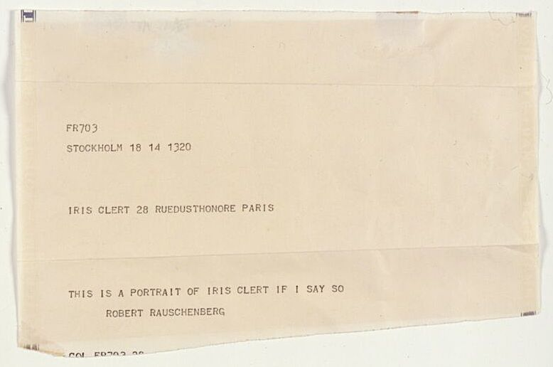 罗伯特-劳森伯格,《如果我这么说,这是艾瑞丝-克勒特的肖像》,电报,11.6×12.9 厘米,1961 年。1961 年,罗伯特-劳森伯格为她的肖像画展致电其法国画廊经纪人