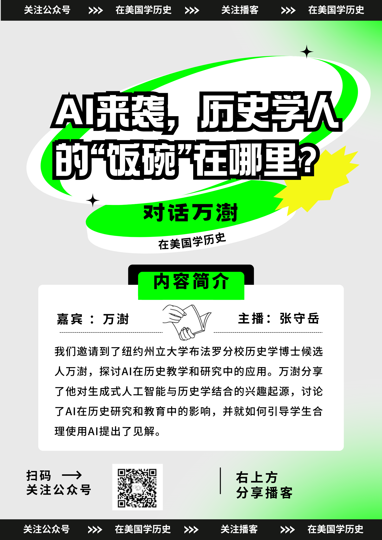 导语:在本期节目中,我们邀请到了纽约州立大学布法罗分校历史学博士候选人万澍,探讨AI在历史教学和研究中的应用。万澍的学术生涯、工作经验与教学领域让他认同AI与数字人文研究相互交织、紧密相连。