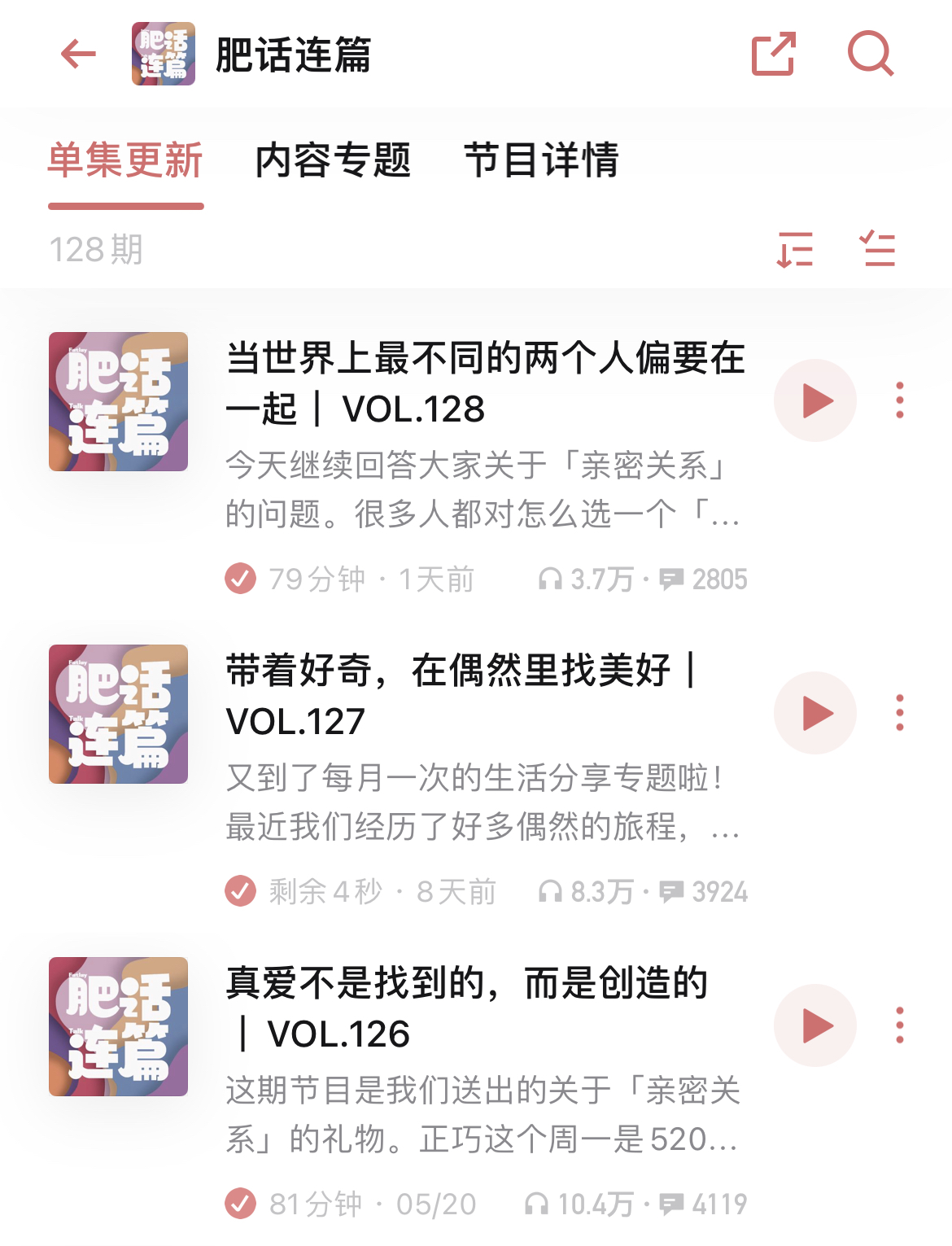 在剪辑录音的这两天,我听很多播客提及了亲密关系的话题,给我提供了新的思路,我想到了自己阐述的观点可能因为认知和阅历不足存在着一定的局限性。用沈奕斐和Steve串台节目里的话来说——相信爱情的人才会花时间寻找和建设爱,爱情是勇敢者的游戏,是无法用理智脑去权衡和思考的。