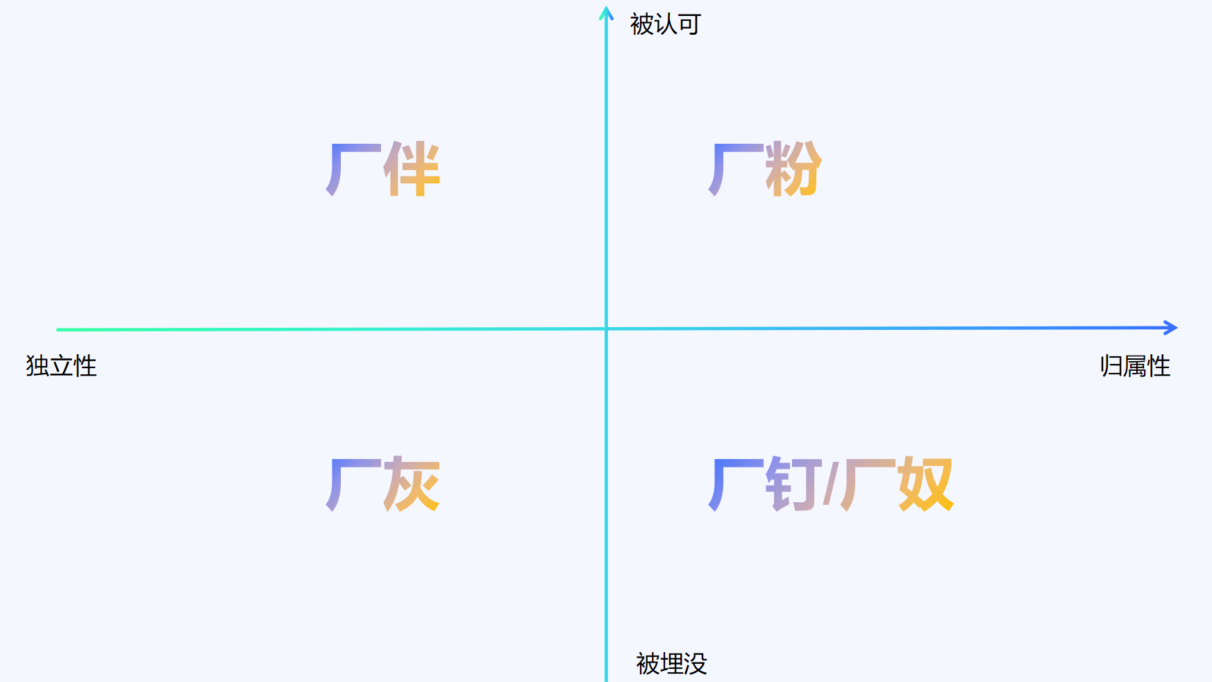 为什么分成这四种人?如下面这张图:根据人与大厂的亲密关系,可以分成四类人。来自我们的画像研究,分水岭是两个:①自我价值是否被厂认可 ②和厂的关系是归属还是独立。