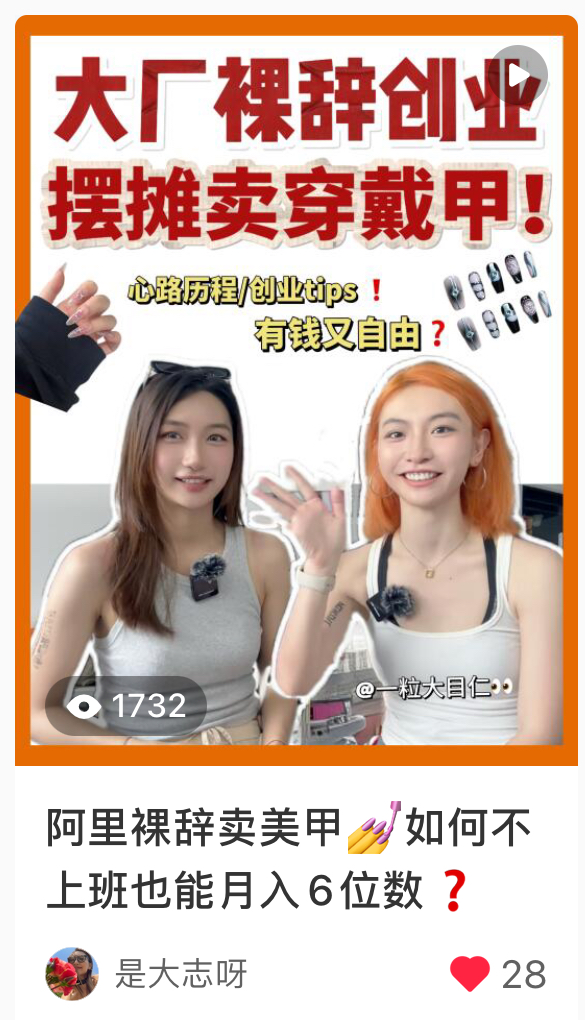 所以我决定去杭州和她一起聊聊,她裸辞背后的思考逻辑是什么?为什么选择穿戴甲这个赛道?这个赛道需要投入多少成本?需要多久回本?她的辣妹穿戴甲品牌,能拼得过5、6块成本的工厂甲吗?人群是谁?