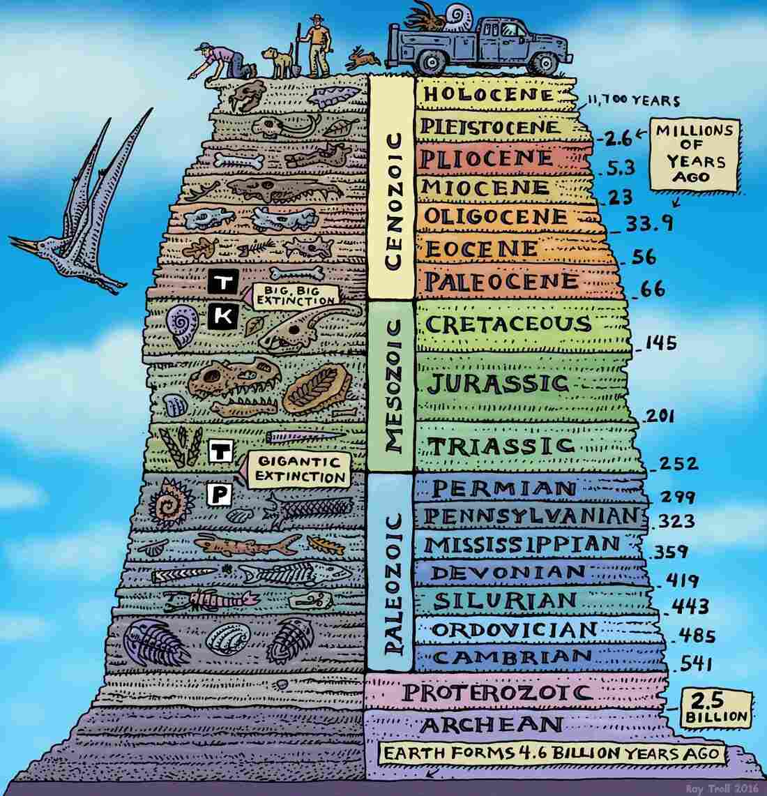 地球的地质历史(图中最上层仍为“全新世”[Holocene],如果“人类世”[Anthropocene]形成共识,那么本图的顶层需要再加一层“人类世”)