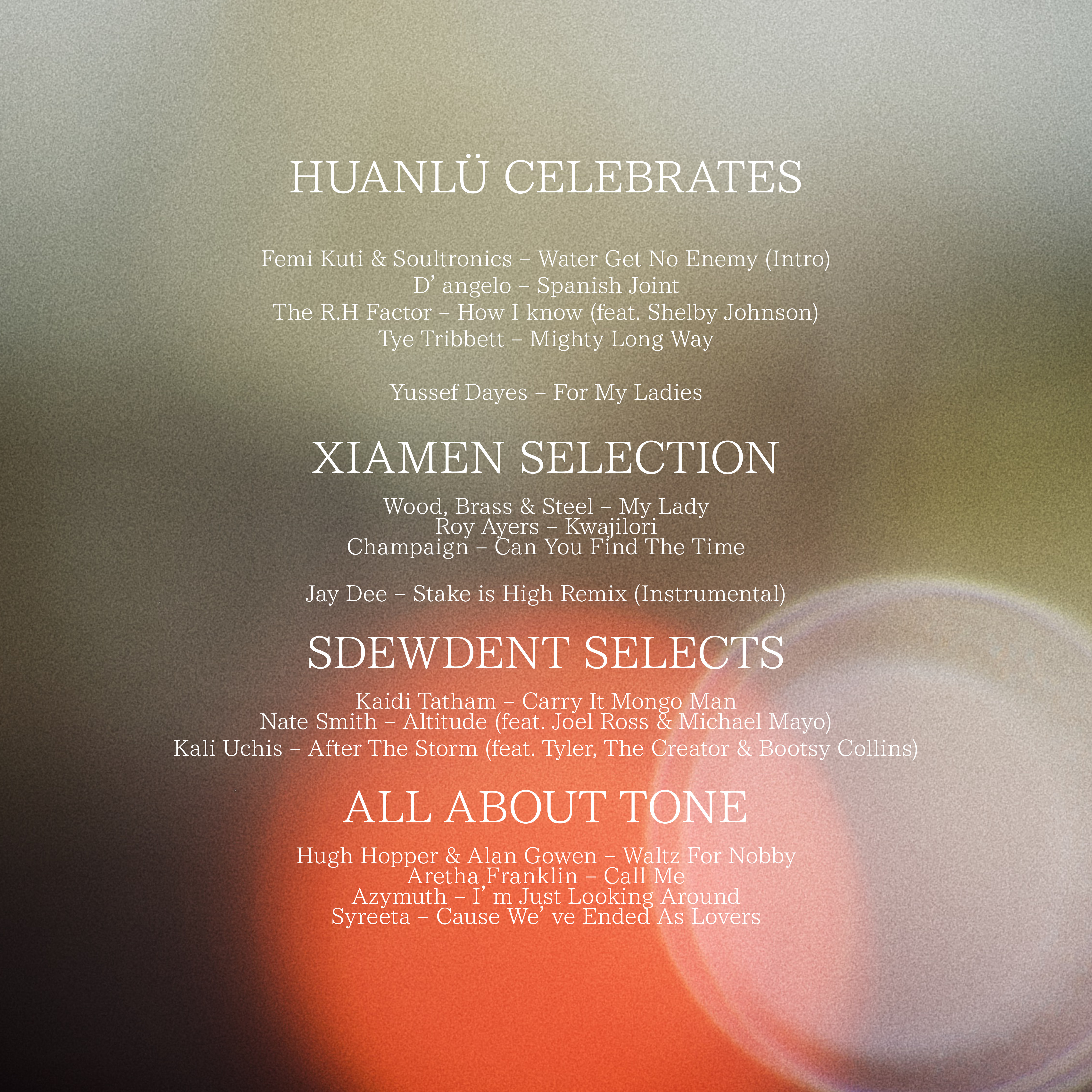 SDEWDENT SELECTS connects us to the current generation of fresh new music. This music is carefully selected by the highly gifted music producer and engineer SDEWDENT who is also part of the HUANLÜ family.