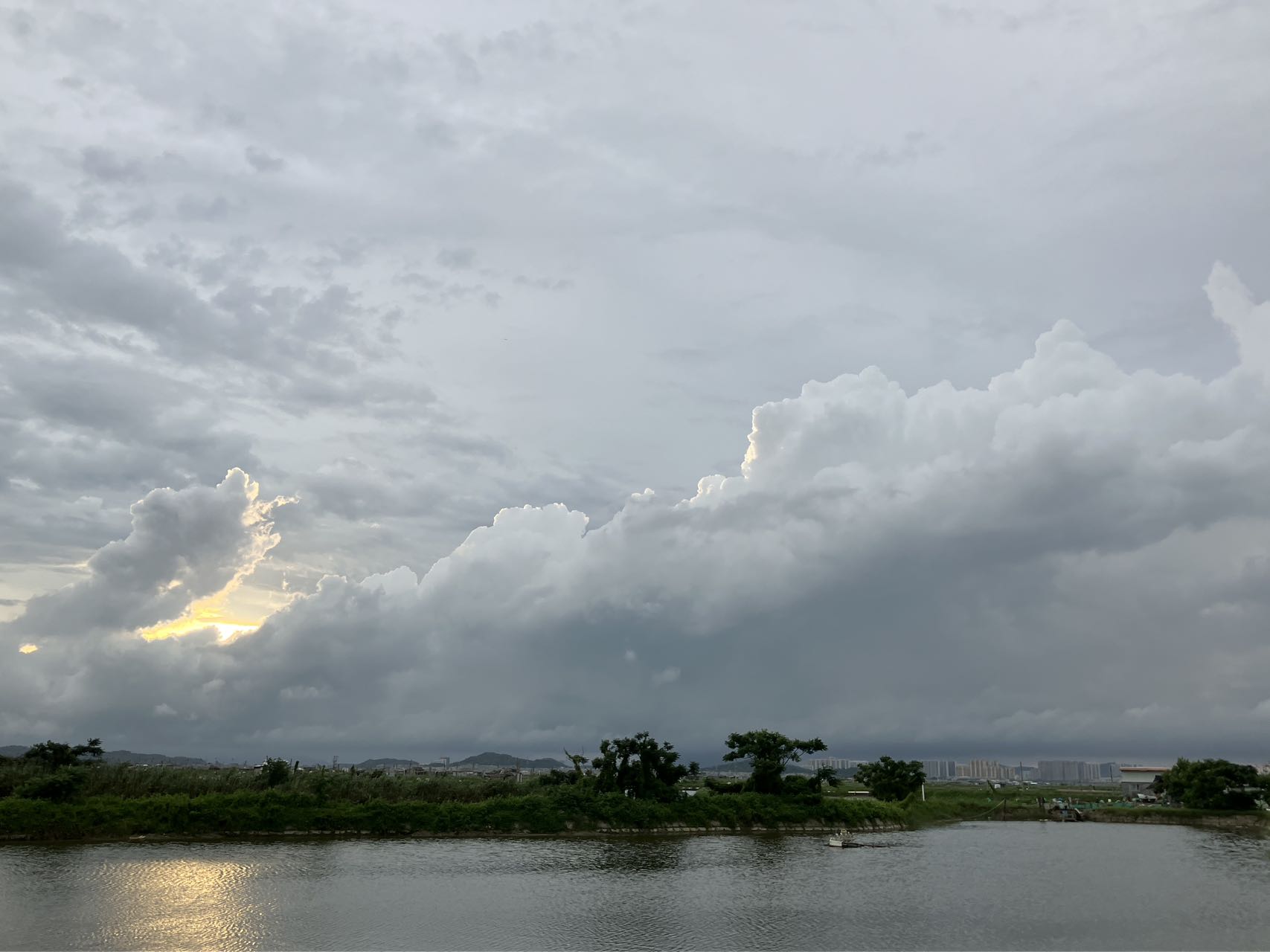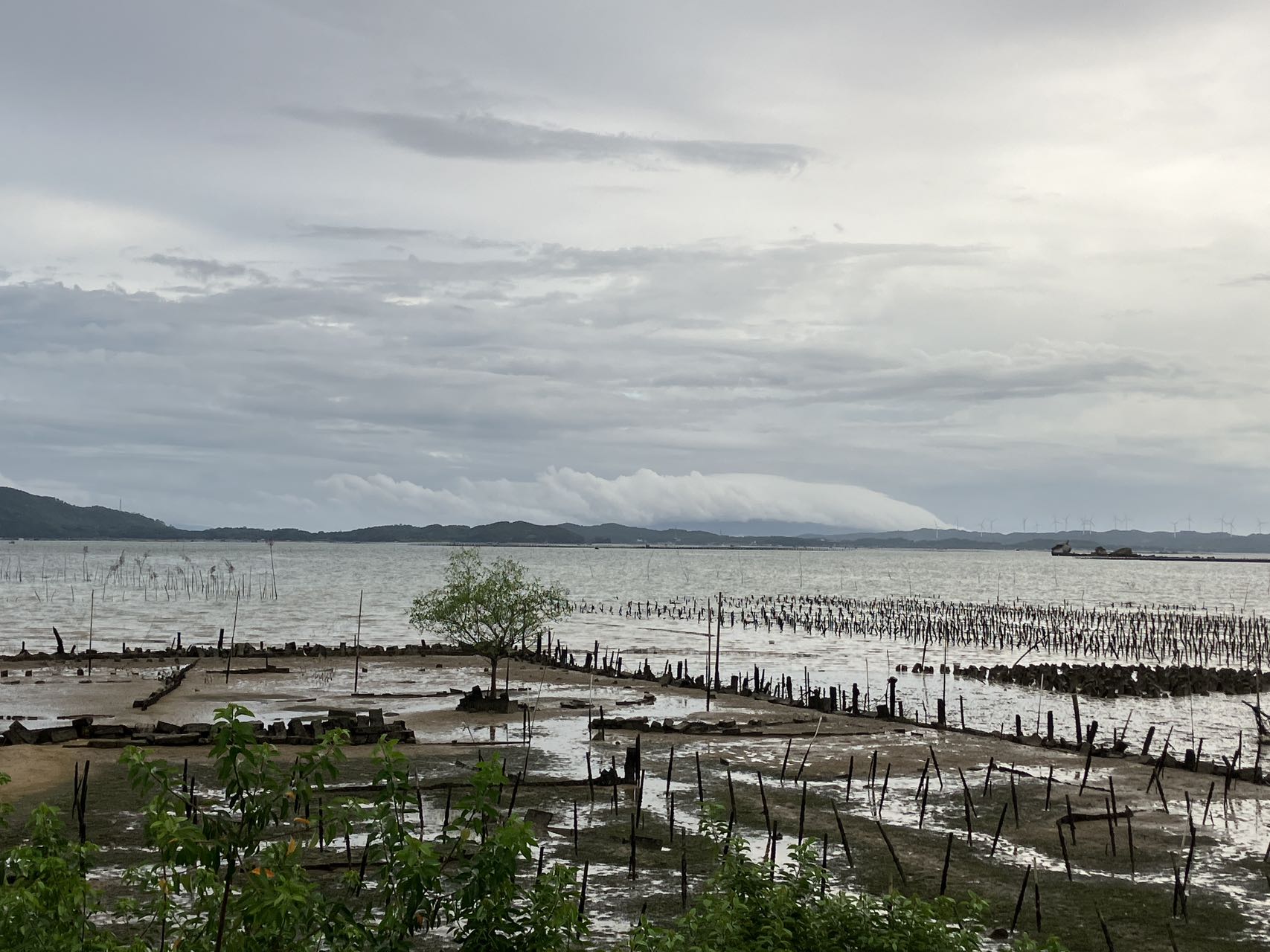 围海造田,近二十年又被改造成渔场和虾场,远处左边是三百门港的集装箱起重机,右边是黄冈镇的商品楼