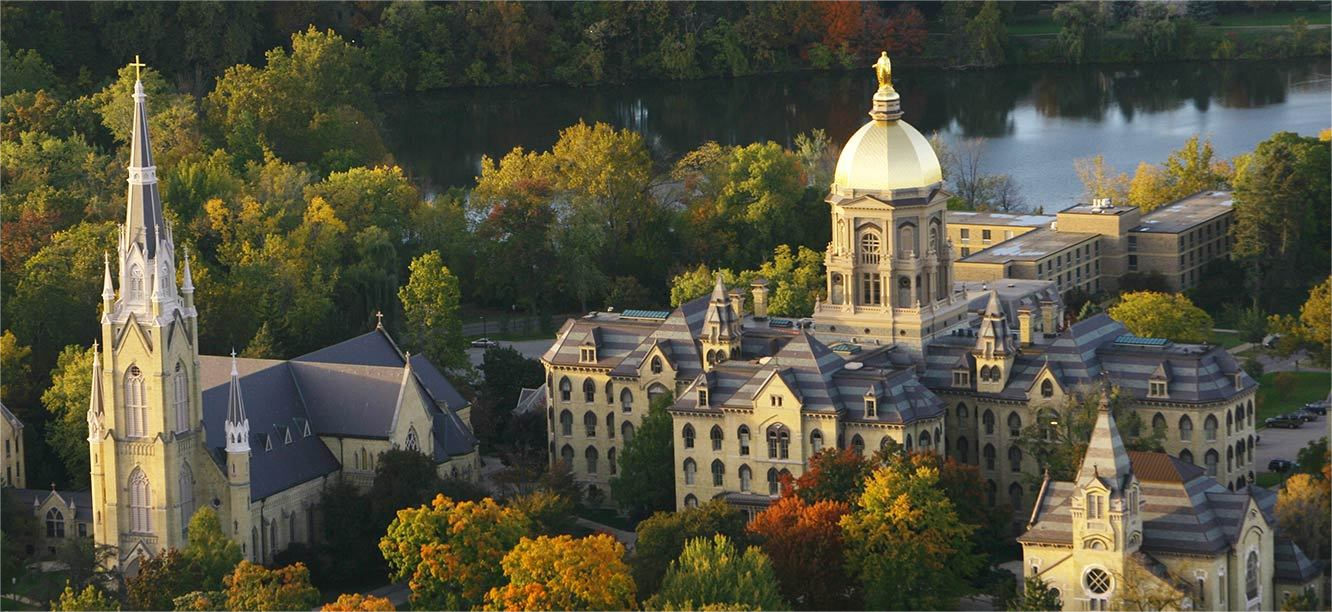 圣母大学校内有泉水湖,也有非常著名的金圆顶主楼、圣心大教堂等。身为小班制精英大学的代表,圣母大学的师生比是1:10,90%以上的班级的学生数量是低于50人的。