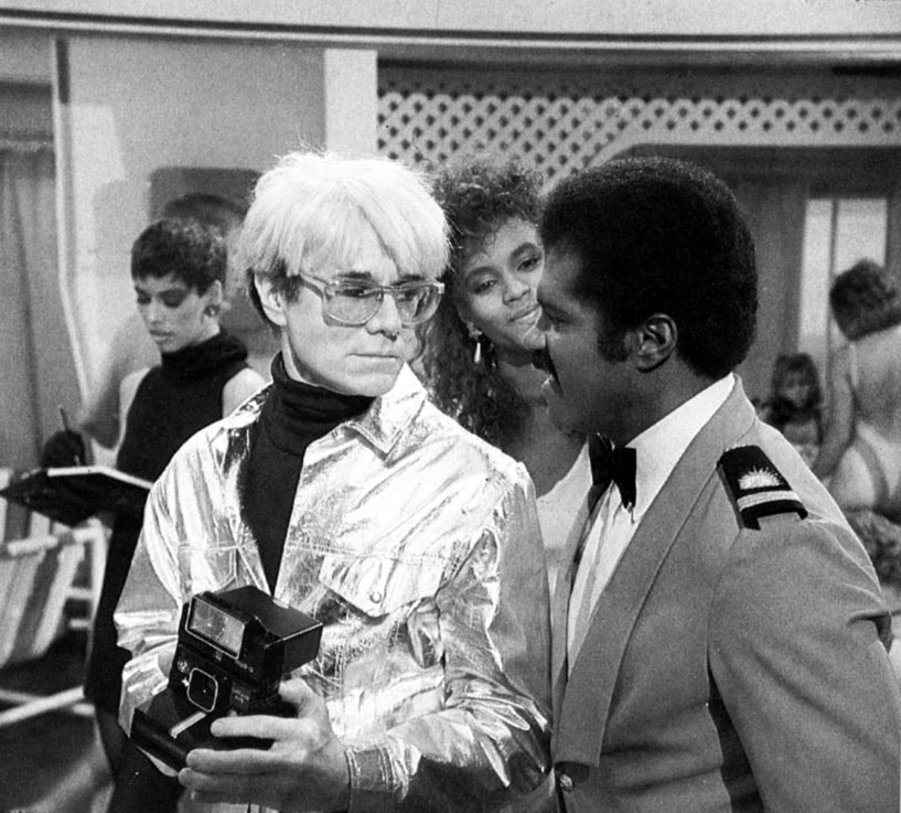 安迪·沃霍尔在美剧《爱情邮轮》(The Love Boat,1985)中与饰演调酒师艾萨克· 华盛顿(Isaac Washington)的泰德·兰格(Ted Lange)在一起