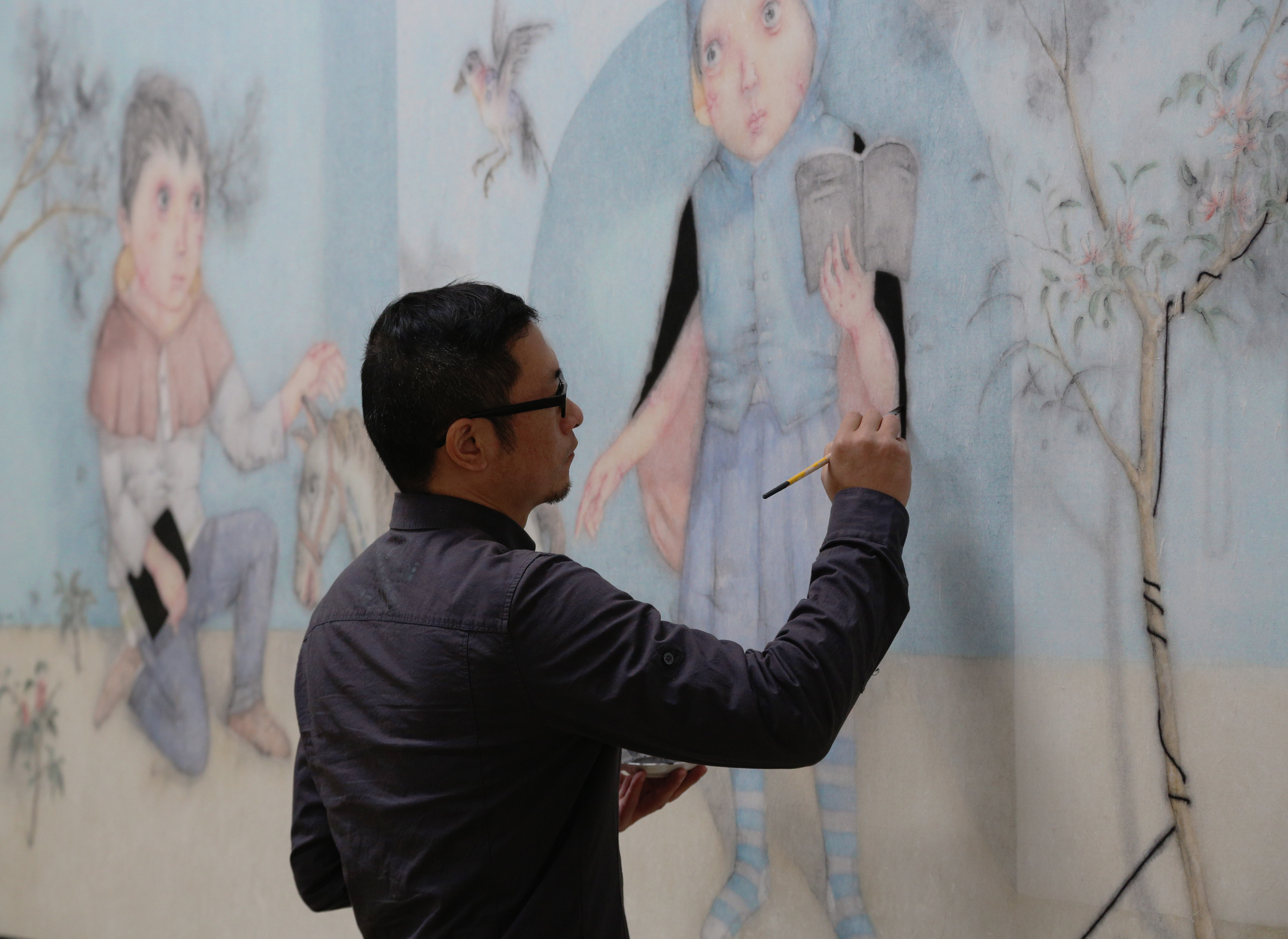 曾健勇1971年出生于广东澄海,1994年毕业于华侨大学中国画专业,1995年结业于中央美术学院版画助教进修班。现工作生活于北京、深圳。曾健勇早期作品以儿童肖像为主,跳脱水墨的传统主题,发展出个人独特的新水墨风格,特别善于探索精神层面的具象化,以各式隐喻与社会性符号提出思辨。他探索从中国传统绘画中提取出规则,以此来观察和表现自然,从而获得新的自由。曾健勇近年的创作从带有超现实主义色彩的场景绘画,到更为综合、宏大的“绘画剧场”,愈来愈摆脱特定题材的限制,转向对绘画本体,特别是绘画空间的研究,探讨水墨在空间中展开的可能性。