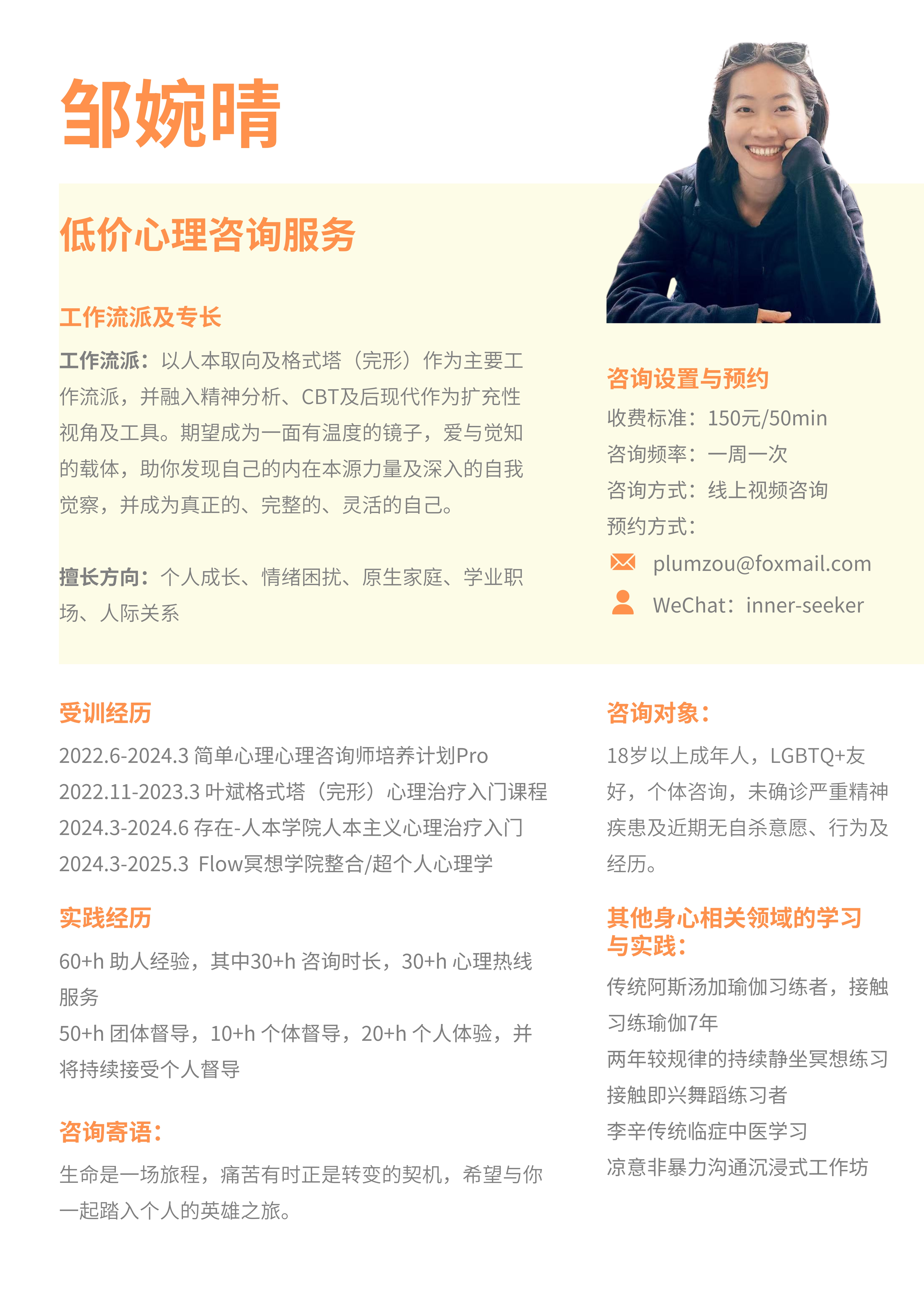 万青,一名心理咨询师,也是一个内在探索者。目前以心理咨询为工具服务,同时也在进行身体探索和练习,期待以更加身心整合的方式进行创造与服务。Being & Serving with love.