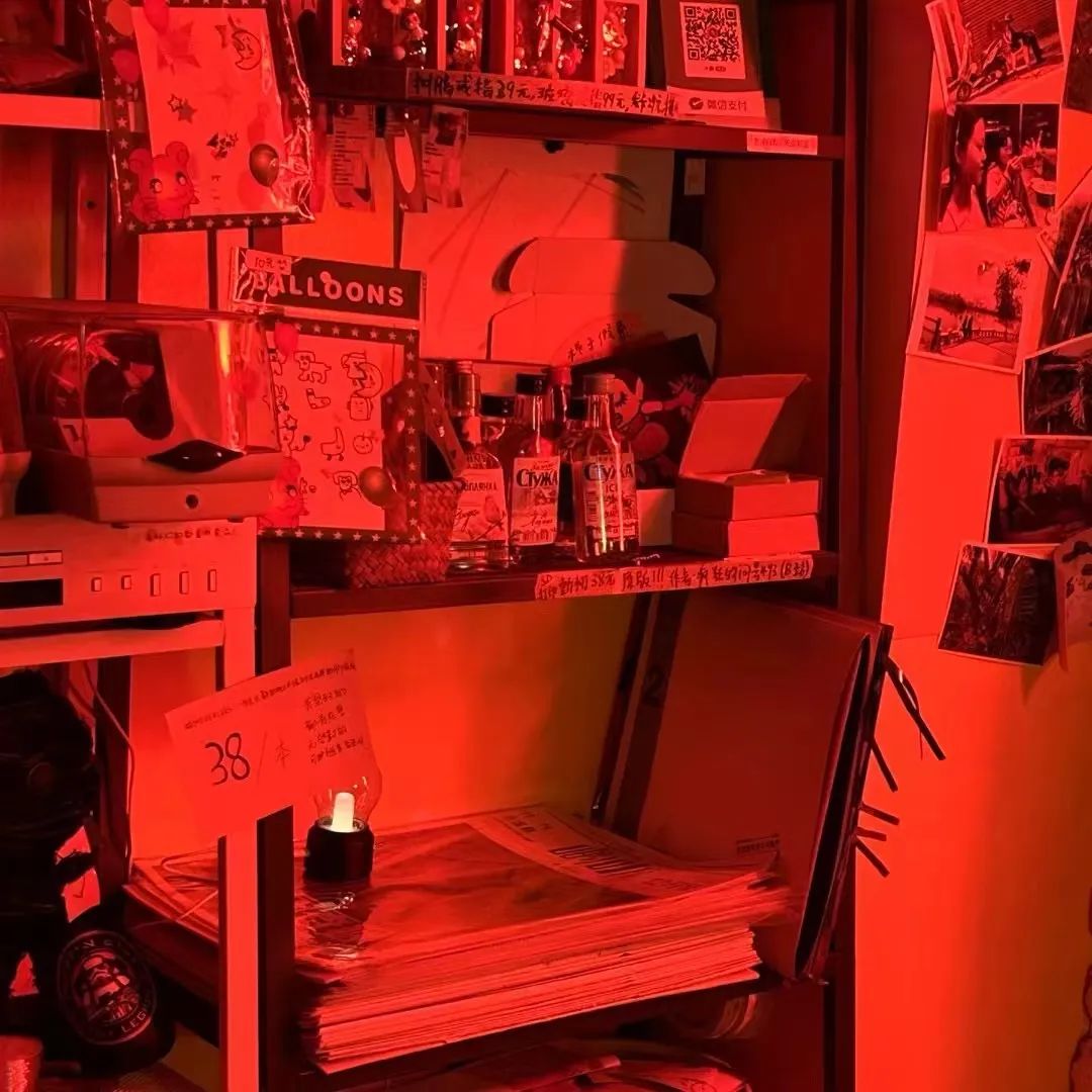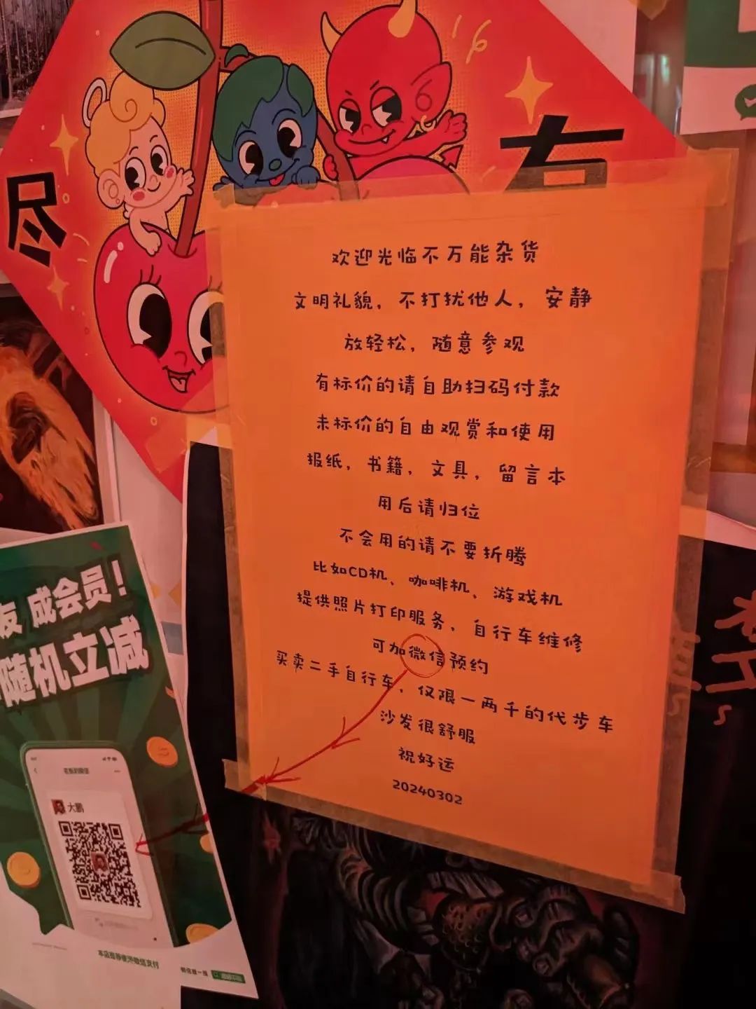不万能杂货其实很万能,这里卖酒、卖少量朋友们的手工艺品/插画/zine、门口的二手自行车也卖的(也提供维修),可以打印照片、海报、文件,有自带梯子的Wi-Fi,沙发区有一台可以看到任何片子的电视,还有XBOX等游戏机。长桌上堆着书、各种杂物以及几乎所有型号的充电线,可以在这里吃饭、用电脑、写留言本。架上有CD机和店主大鹏的老唱片,架下堆放着朋友们的快递。再往里有咖啡机、饮水机、空气炸锅、微波炉,最近刚刚升级添置了手冲套装。贴满了留言和合照的冰箱里总是可以翻出一些隔夜饭菜或在附近咖啡店工作的朋友带回的过期牛奶。带烘干的洗衣机在回南天广受欢迎,对面的厕所是涂鸦天堂。