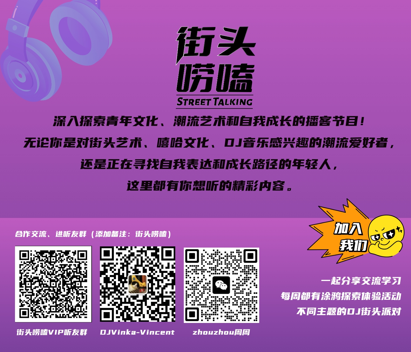 {无论是街头艺术、嘻哈文化、DJ音乐感兴趣的潮流爱好者,或是正在寻找自我表达和成长路径的年轻人【街头唠嗑】就是最懂你的小伙伴!}