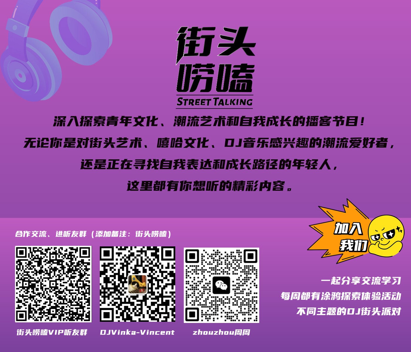 {无论是街头艺术、嘻哈文化、DJ音乐感兴趣的潮流爱好者,或是正在寻找自我表达和成长路径的年轻人【街头唠嗑】就是最懂你的小伙伴!}