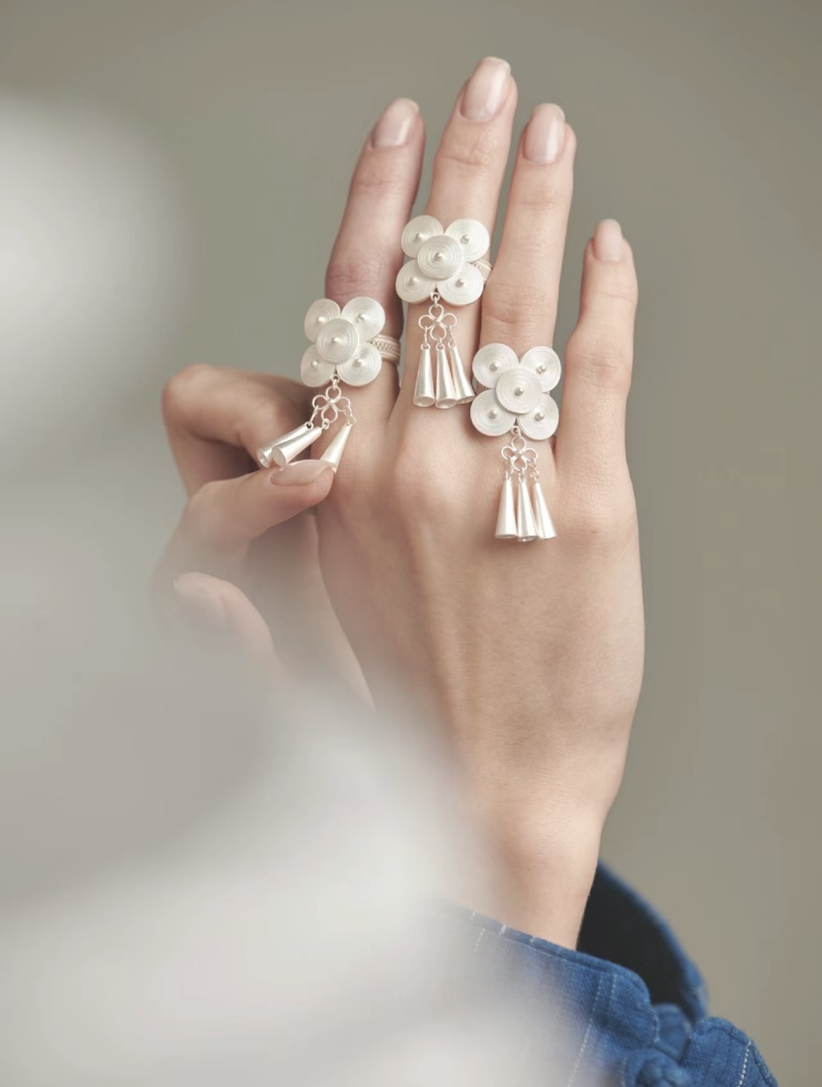 也许当初CUNZU吸引我的,也正是这种民族极繁主义中的原生美感。我尤其喜欢吴迪在戒指上加以缀饰的设计。她给它们取名为“穗”系列。是流苏的缀穗,也像是黔东南山间稻田里丰收的稻穗,心意朴素,寓意吉祥。戒指与“穗”碰撞中,随身携带一路清脆,整个人的出场都有了配乐,像是怡然自得的歌唱。