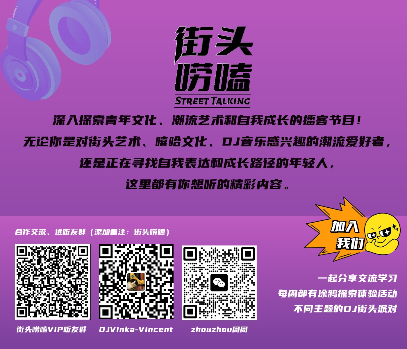 {无论是街头艺术、嘻哈文化、DJ音乐感兴趣的潮流爱好者,或是正在寻找自我表达和成长路径的年轻人【街头唠嗑】就是最懂你的小伙伴!}