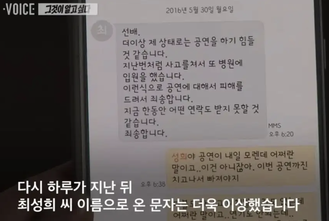 崔小姐:“前辈,我目前的状况无法演出。和上次一样又出事故住院了,这样突然无法演出我很抱歉,现在不方便接受如何联系,对不起”