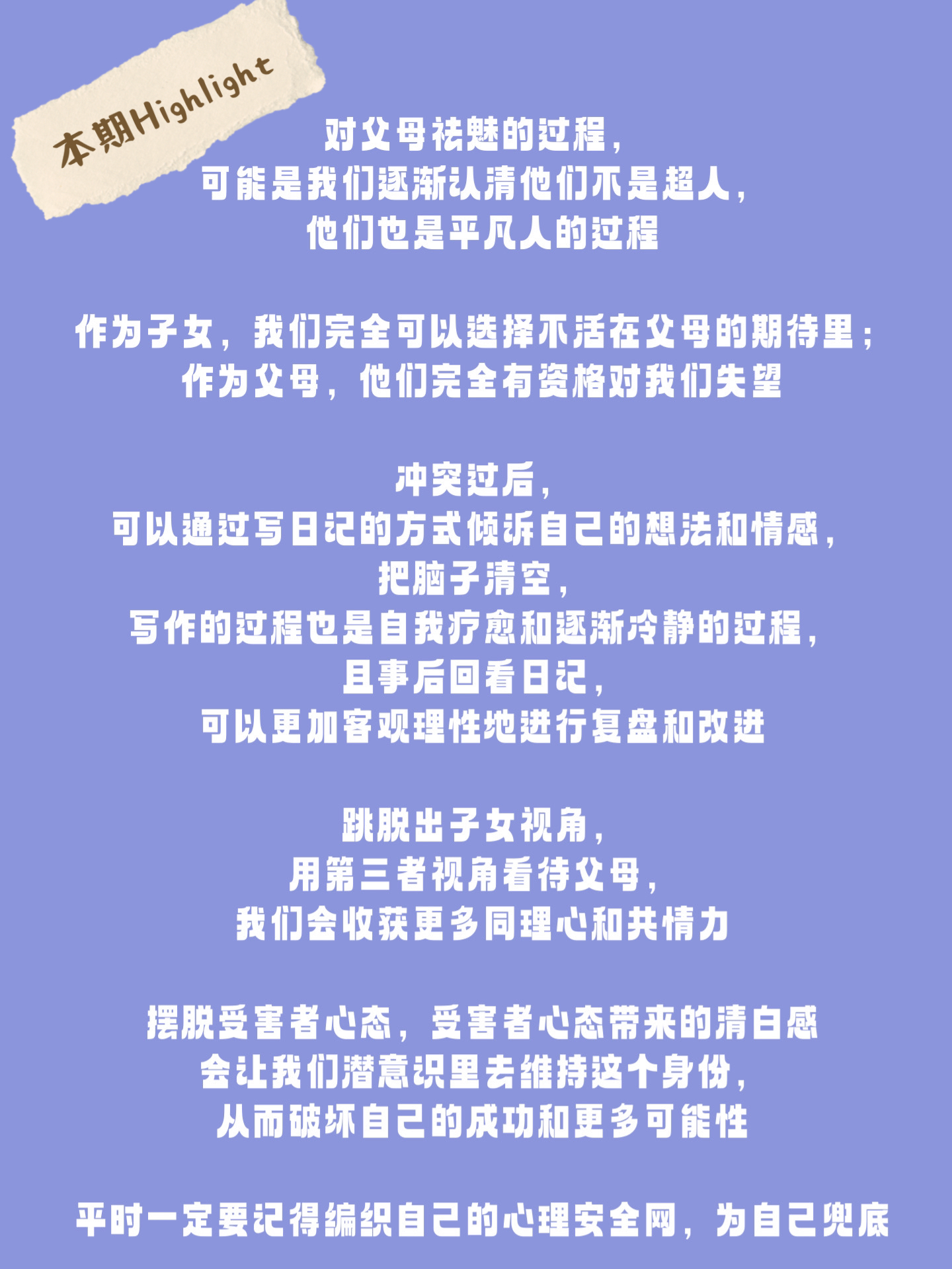 朋友们,通过这期节目我们想说,再幸福的原生家庭其实也会有伤痛和困惑,你不孤单,我们需要自助、互助,在代际隔阂中与负面情绪共舞,追求自己觉得有意义的人生。
