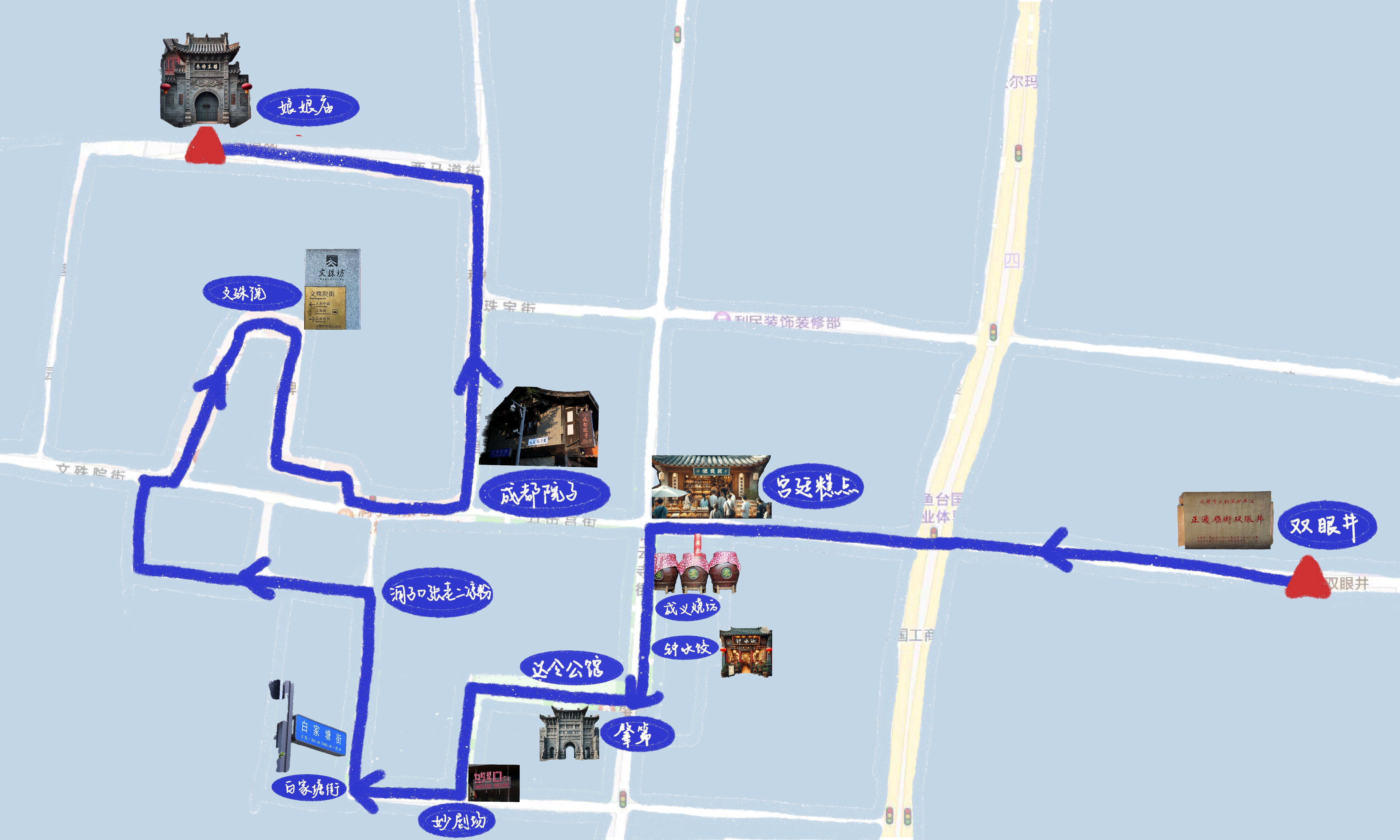 【本期路线】双眼井-正通顺街-酱园公所街-宫廷糕点铺-白云寺街-五岳宫街-梨园川剧变脸-金马巷-洞子口老张凉粉总店-香庐茶园-文殊院-文殊院巷-西马道街-娘娘庙