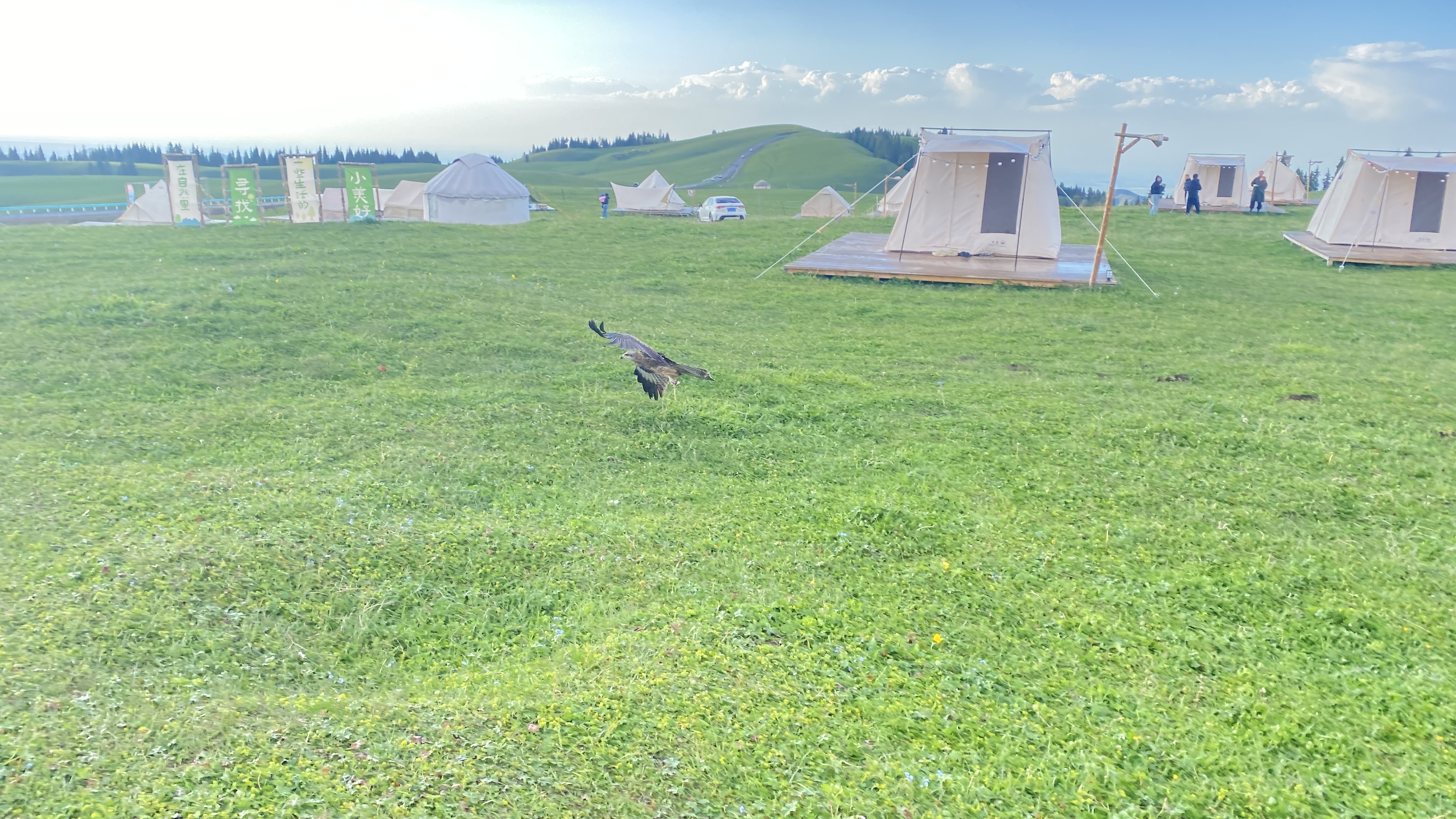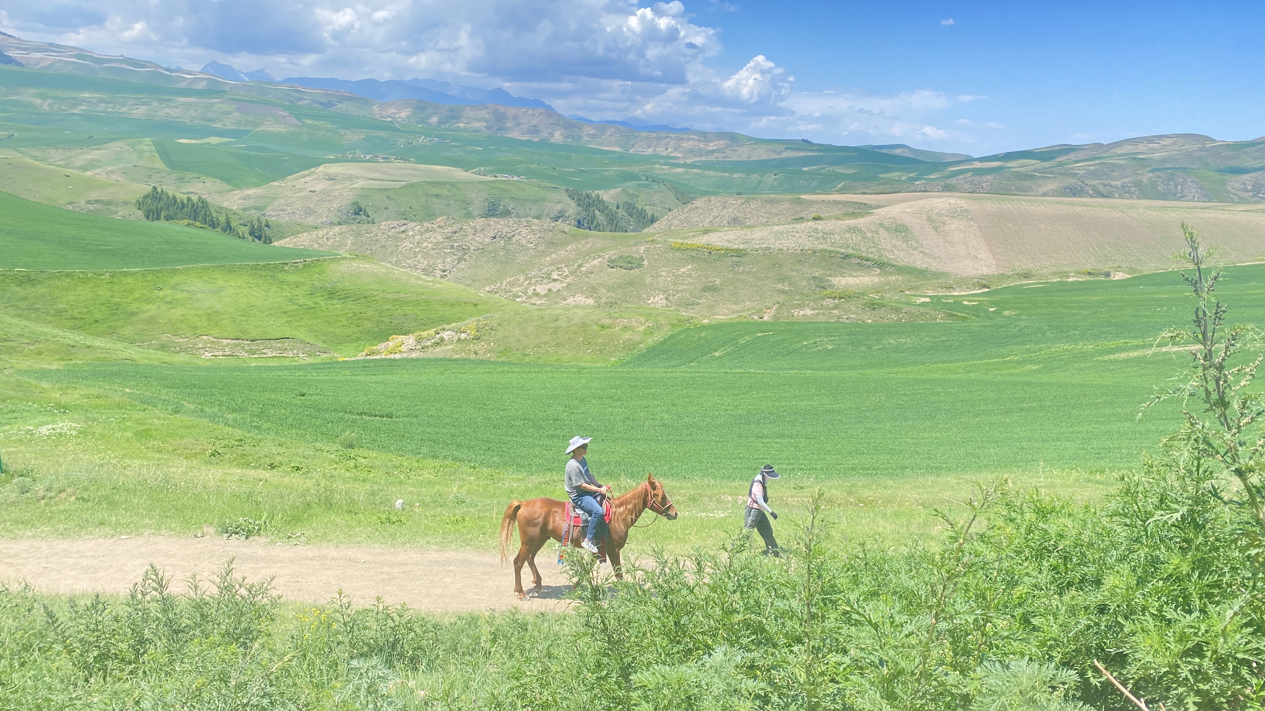江布拉克景区一望无际的麦田与骑马走过的游客