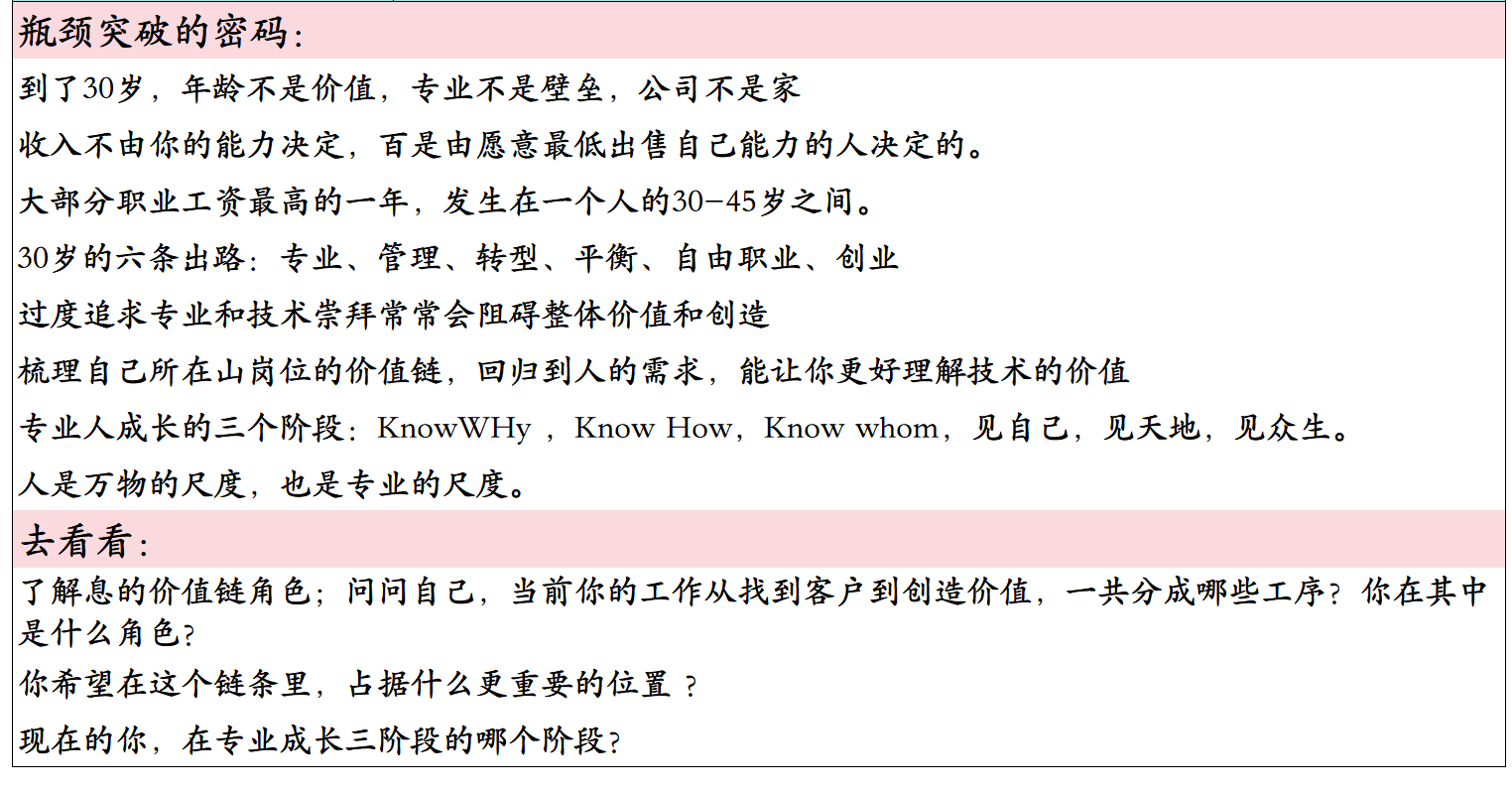 - 对已经发展了三四年的人说的话:“去闯一闯,去改变,去多了解一些业务,包括技术方面的,去多去扩大自己的知识面,这个是很重要的。因为很有可能在比如说三四年之后,很有可能就处于慢慢的很快就陷入那种倦怠期了”
