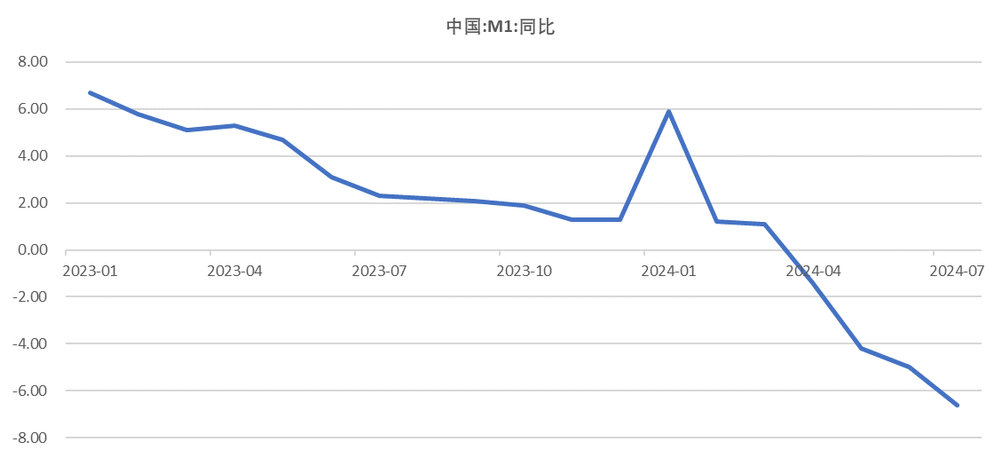 从近几个月的M1、M2数据来看,虽然M2还维持在每个月6%-7%的同比上行,但M1已经连续4个月(截止2024年7月)进入同比为负的状态。