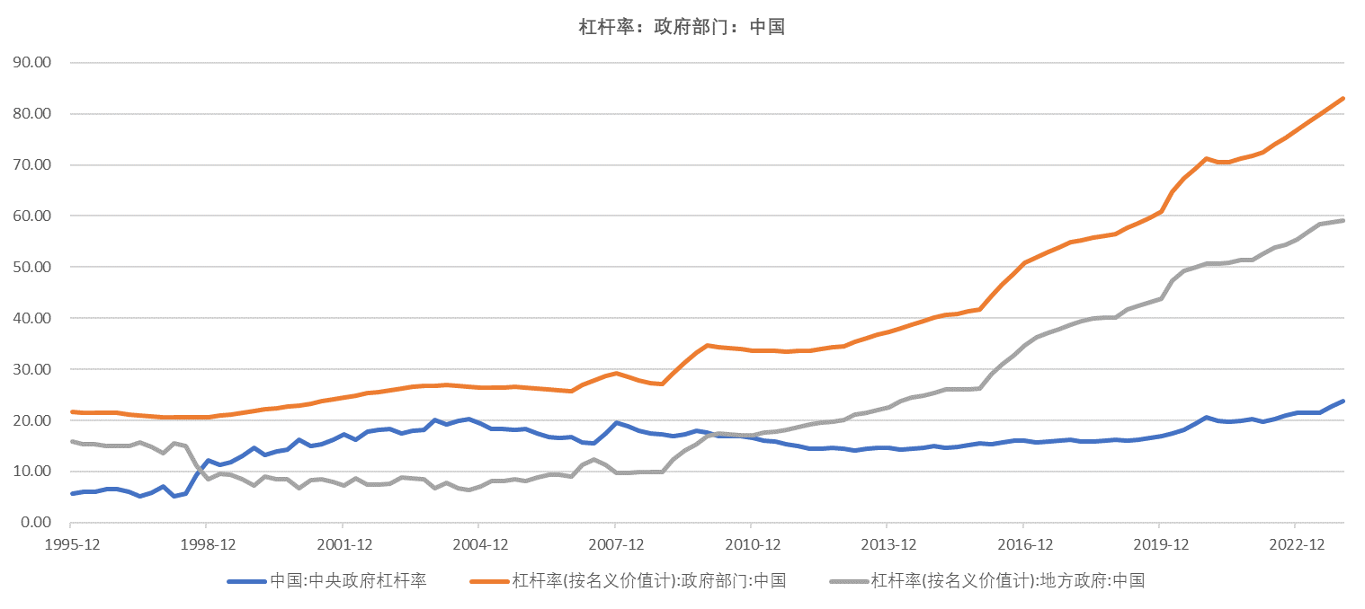 上面图表也显示了当前中国中央政府的杠杆率水平,大约是23%到24%之间;这个水平相较于日本、欧美都还有显著的差距。较低的杠杆水平赋予了中央政府较高的扩表能力;当前的宏观经济情况及各个其他部门的财务状况也决定了中央政府在修复经济及社会信心层面责无旁贷。事实上,今年中央财政也的确通过发行特别国债,及扩大地方政府施用特别国债融资的范围等方面,给予了经济及地方财政更有效的支持。