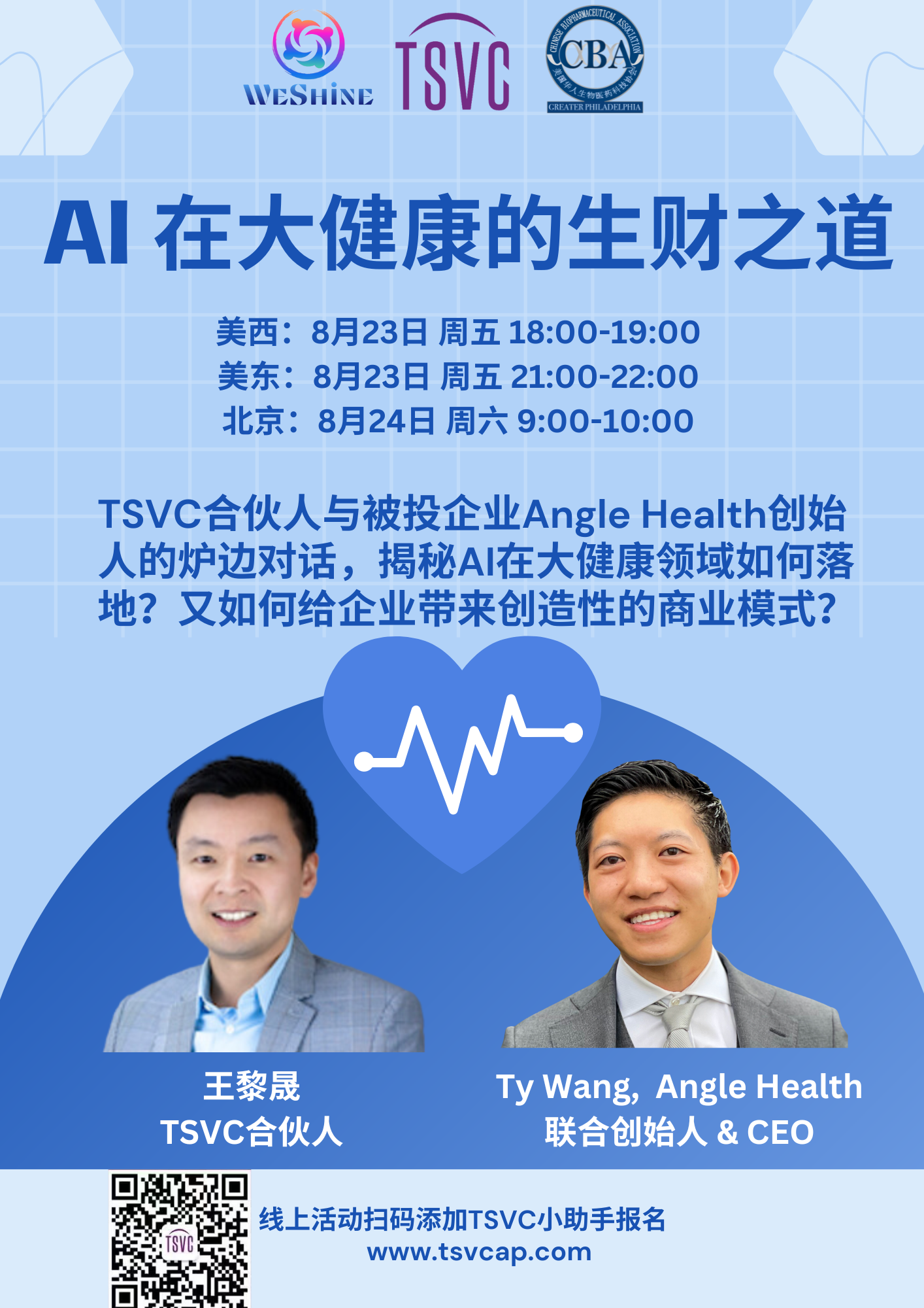 8月24日TSVC举办了《打造下一个独角兽》讲座第32讲。这次活动由TSVC主办,协办方包括WeShine和美国华人生物医药科技协会(CBA)费城分会,我们有幸邀请到TSVC合伙人王黎晟炉边对话Angle Health联合创始人兼CEO Ty Wang,探讨和揭秘AI在大健康领域如何落地?又如何给企业带来创造性的商业模式?