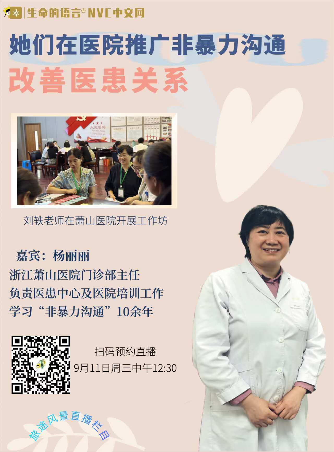 医院里的非暴力沟通!庆祝“见证一个充满善意、正能量的医疗团队,以及Ta们如何探索更加人性化、人文的医患沟通和关系”🎉🌈本期旅途风景邀请了将NVC引入浙江萧山医院的杨丽丽主任分享非暴力沟通在医院的实践故事!