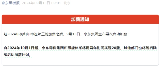 9月13日,京东集团发布公告,将再次启动加薪计划。自2024年10月1日起,京东零售、京东职能体系将用两年时间实现 20 薪,其他部门也将陆续启动加薪计划。
