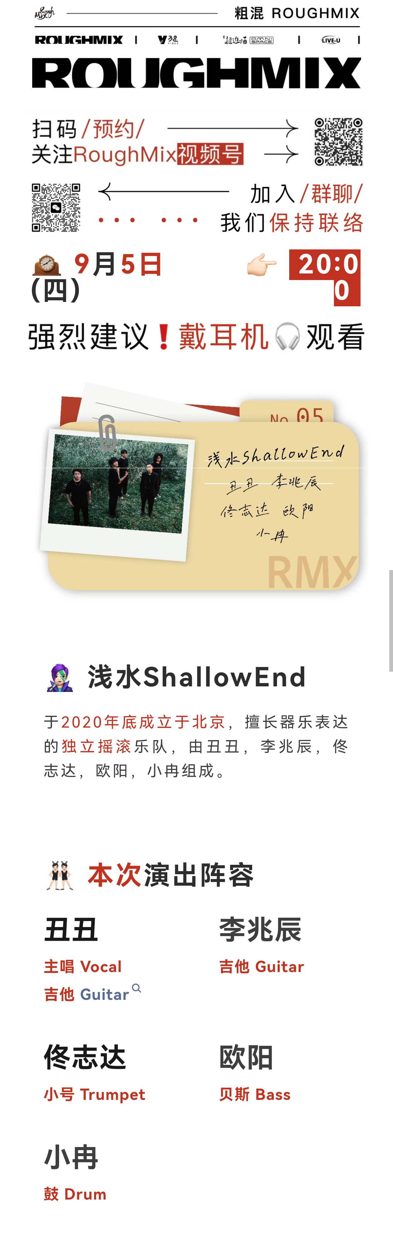 原来乐队私下里都是这样的!?关于浅水巡演背后的故事,浅水主唱的老板竟然是?更多精彩请收听RMX小宇宙电台~一定听到结尾哦,内含全平台未放送版花絮~~【本期乐队】浅水ShallowEndPlaylist:02:00 《生长》12:16 《我们转瞬就错过》17:48 《坠落的人》29:38 《小鸠》 点击跳转完整视频