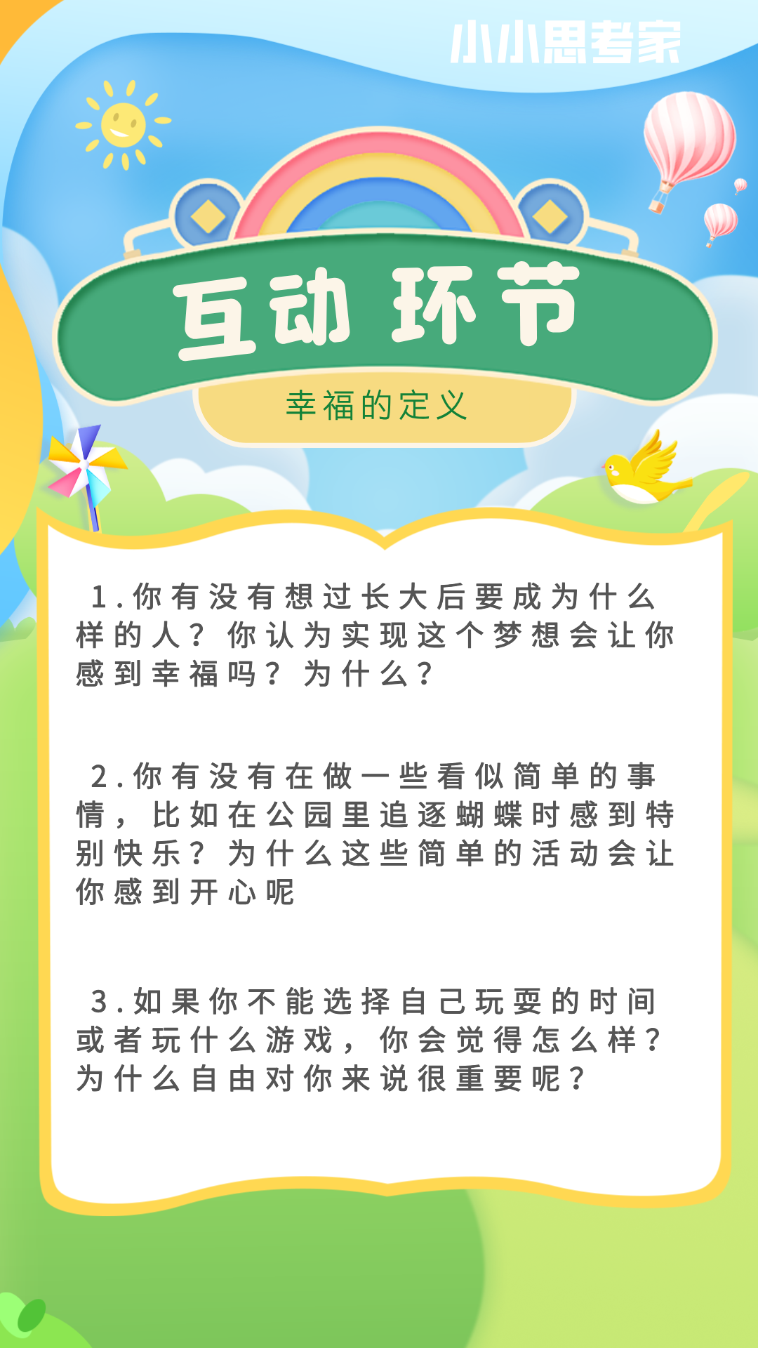 下图提供了关于幸福的定义的思维导图,以及可以和孩子们沟通的话题内容,可以参考一下哟❤️