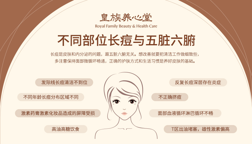 经常能看到很多说不同位置长痘是因为你身体对应的某个位置出了问题的言论,比如,额头长痘对应肝火旺,鼻子长痘是肠胃有问题。实际上,这些说法都并无依据。长痘位置确实有迹可循,但不一定是和脏腑相关。比如深层火火、清洁不到位等都可能造成痘痘反复或者某一部位频繁长痘。