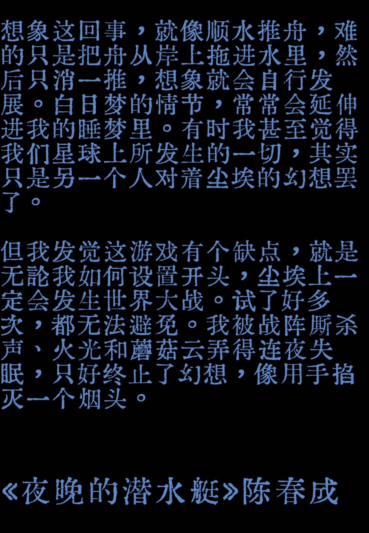 highlight*我主观的相信想象跟现实之间是有一道微小到不能再微小的裂缝的,裂缝之间藏着一念之间的变化。*我现在想这大概是一种缘分的微妙感吧,我的想象和我的现实撞了个满怀然后两这在我的心里都摔倒了,摔倒的那一下,我的心地震了,就是这种感觉。*想象固然好,但是不行动起来就是摆设*内耗的反义词一定是行动,你行动起来后内耗就追不上你了,因为你的每一步都结结实实的踩到了地面上,不像想象一样踩着棉花。